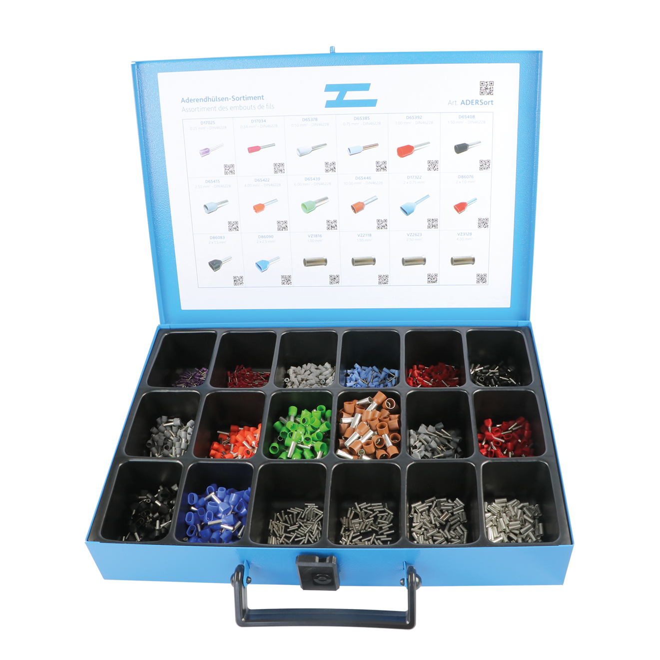 Sortiment Twin-/Aderendhülsen isoliert/unisoliert im Metallkoffer mit 18 Fächern. Inhalt: 1’800 assortierte Hülsen, 0.25 bis 10.0mm2Abmessungen330x230x54mmGarantie2 Jahre