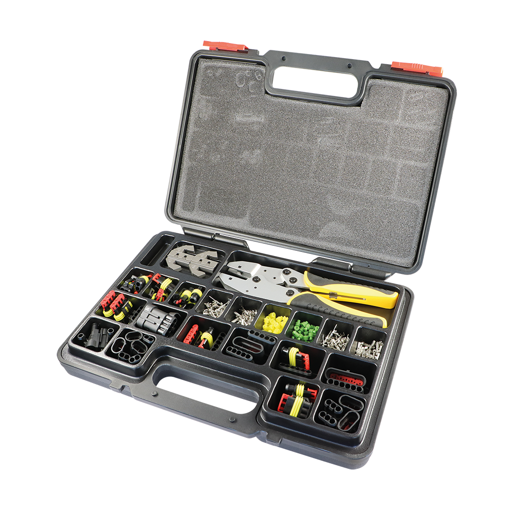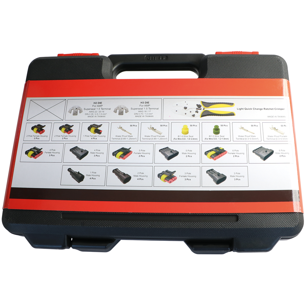 Sortiment AMP Superseal (339-teilig) mit 1 - 6 poligen Stecker-Paaren, Pins und Dichtungen sowie ultraleichter Presszange und wechselbaren Einsätzen H2 & H3 im Kunststoffkoffer (37 x 28 x 7 cm).
