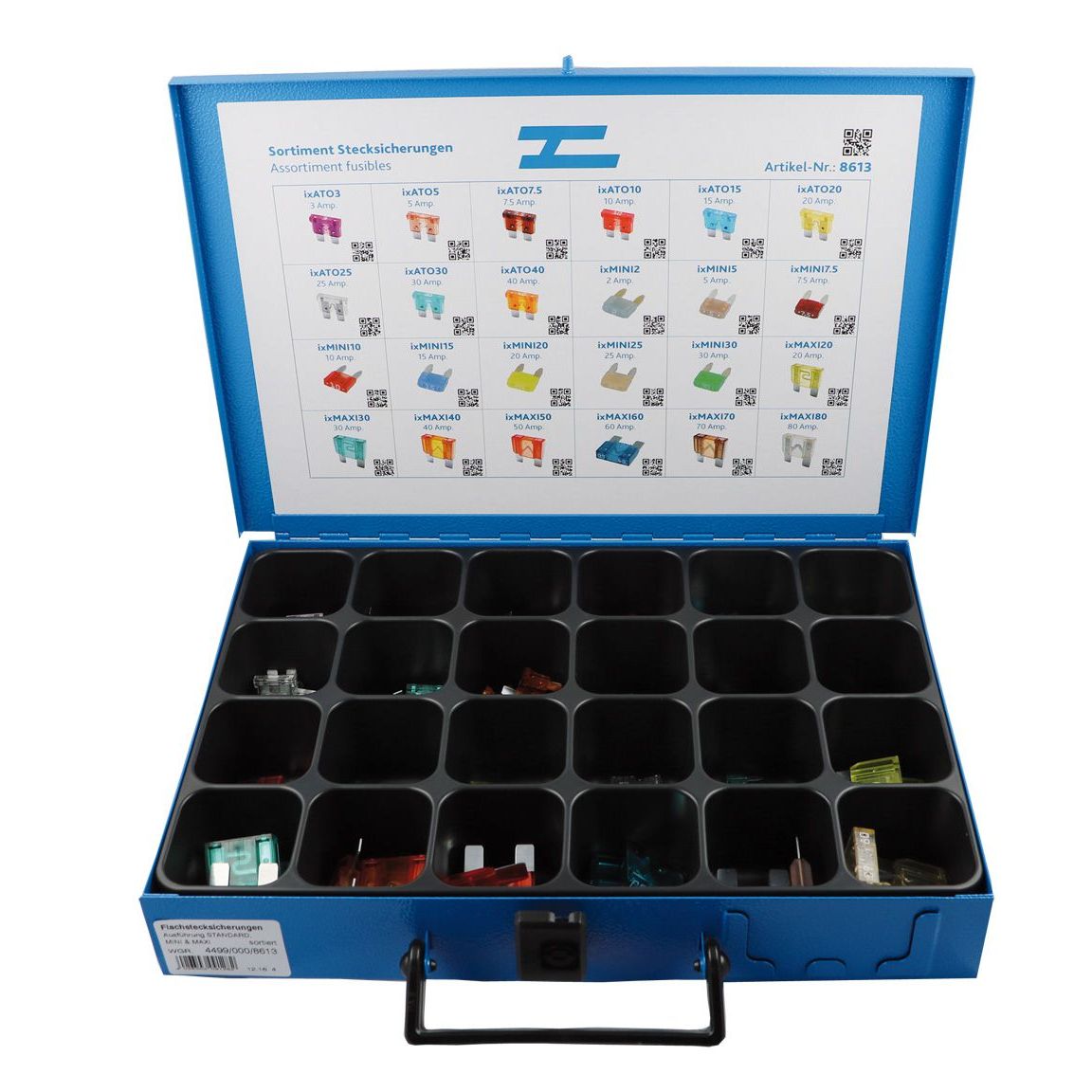 Sortiment Flachstecksicherungen ATO/MINI/ MAXI im Metallkoffer mit 24 Fächern. Inhalt: 276 assortierte Sicherungen: 135 Stk ATO: 3...40A 120 Stk MINI:...