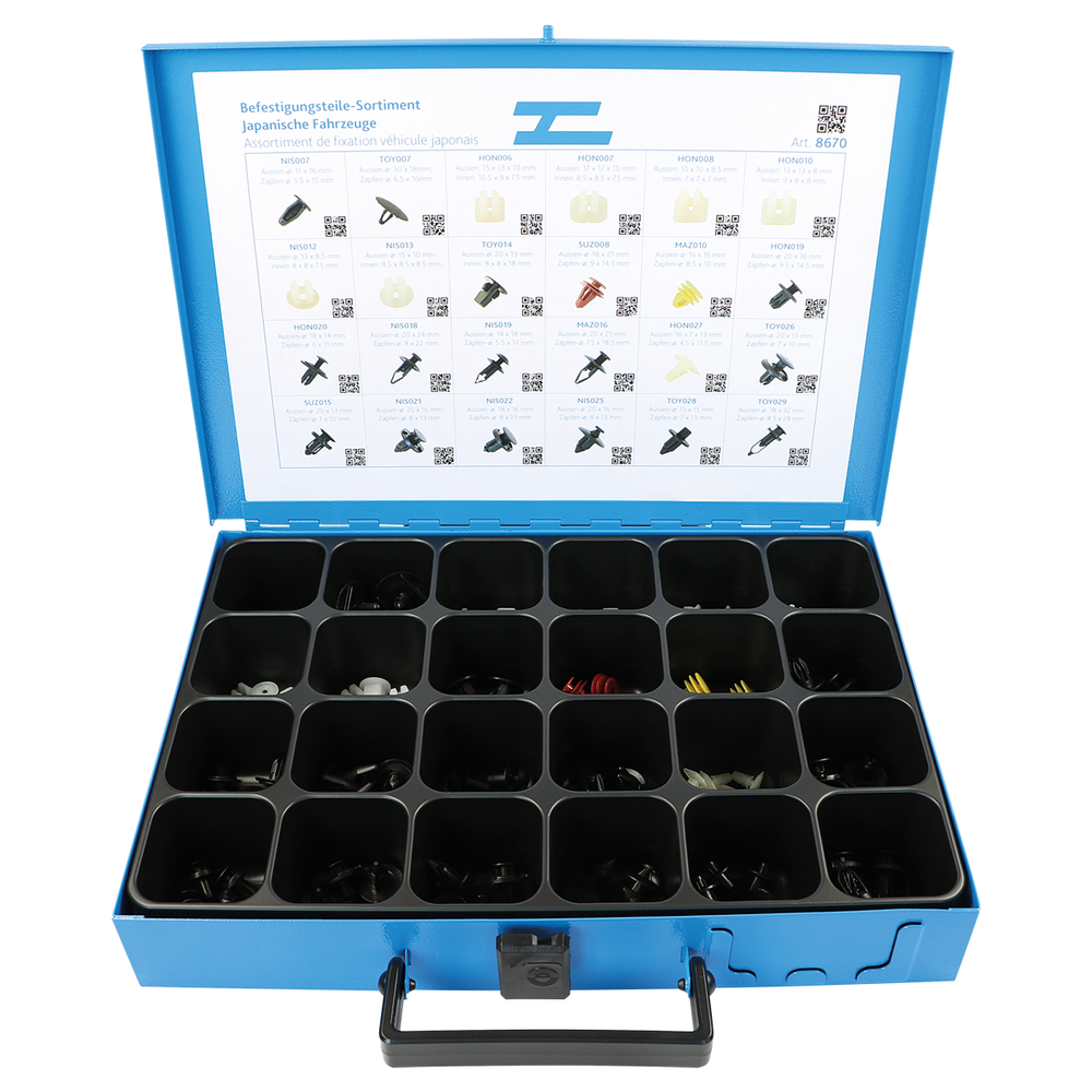 Sortiment Befestigungsteile Japanische Fahrzeuge (Toyota, Nissan, Honda, Mazda, Suzuki) im Metallkoffer mit 24 Fächern.