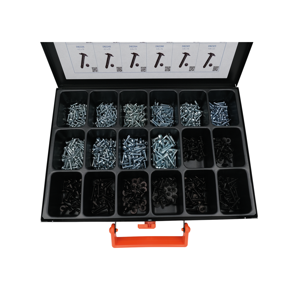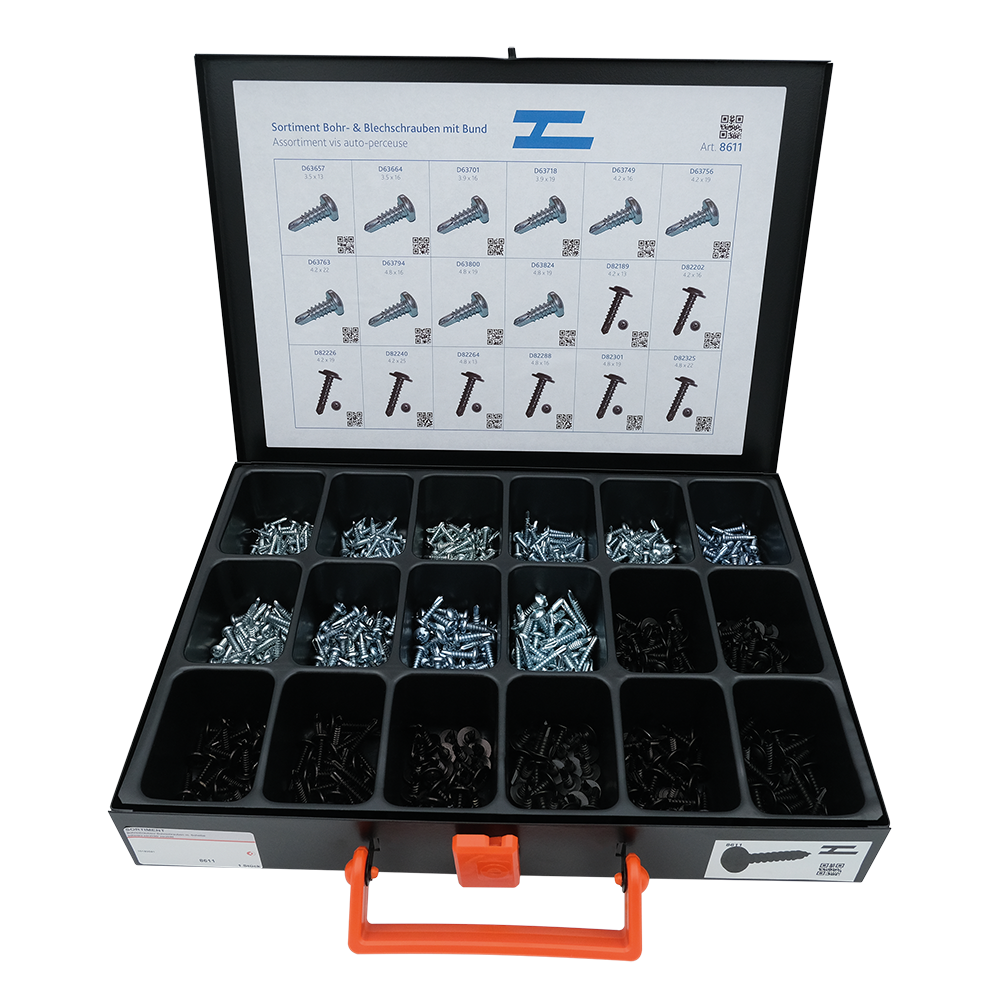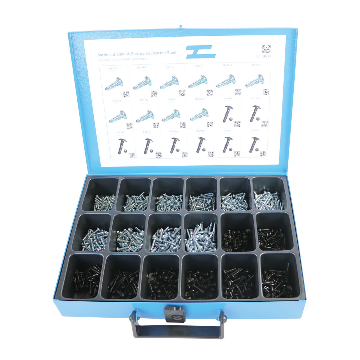 Sortiment Blechschrauben mit Kreuzschlitz und angepresster Scheibe selbstbohrend, schwarz verzinkt & Blechschrauben mit Kreuzschlitz selbstbohrend, verzinkt im Metallkoffer mit 18...