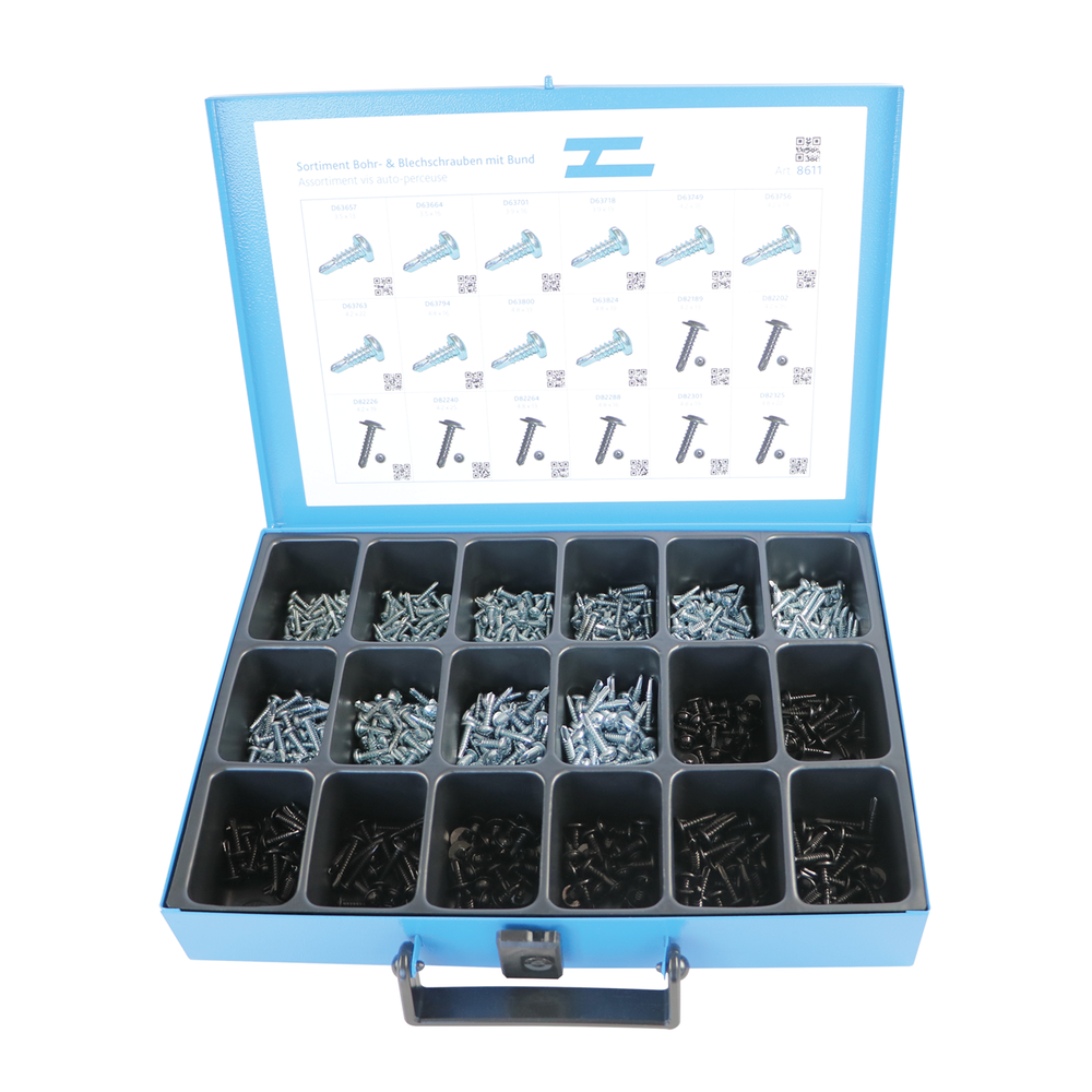 Sortiment Blechschrauben mit Kreuzschlitz und angepresster Scheibe selbstbohrend, schwarz verzinkt & Blechschrauben mit Kreuzschlitz selbstbohrend, verzinkt im Metallkoffer mit 18 Fächern,