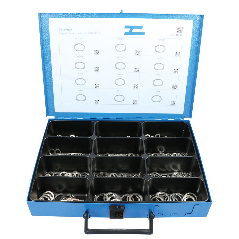 Sortiment Alu-Dichtringe DIN 7603 im Metallkoffer mit 12 Fächern. Inhalt: 280 assortierte Dichtringe Aluminium massiv von 6x10mm - 22x27mmAbmessungen330x230x54mmGarantie2 Jahre