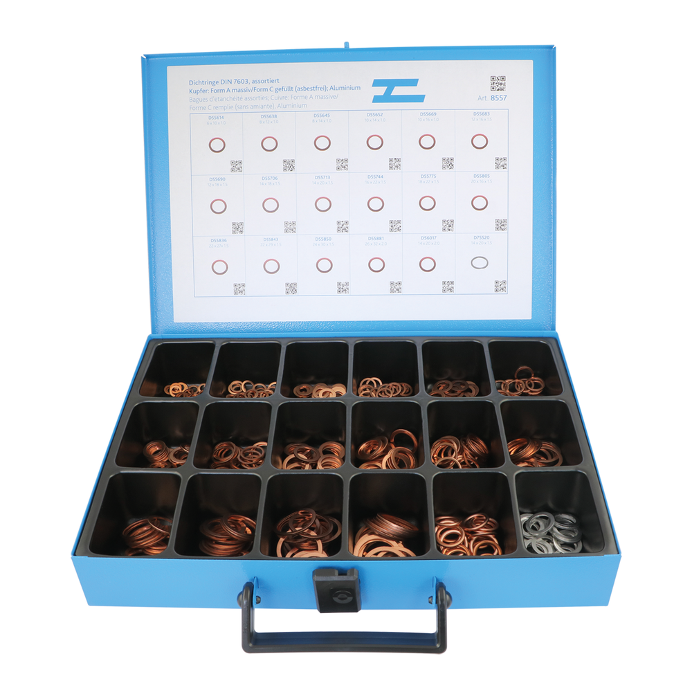 Inhalt: assortierte Dichtringe (Kupfer massiv/gefüllt und Alu-Ringe) DIN 7603