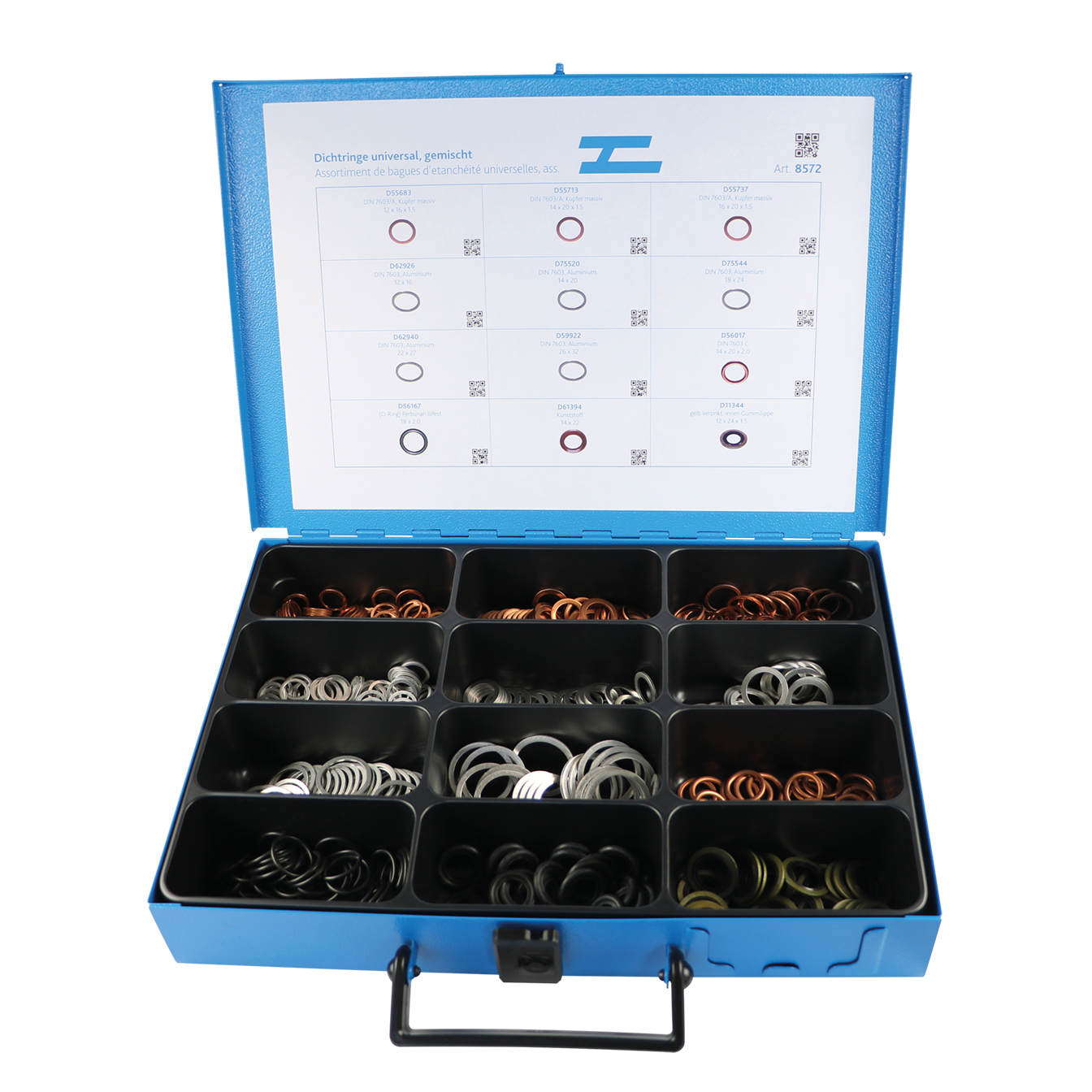 Sortiment Dichtringe im Metallkoffer mit 12 Fächern. Inhalt: 425 Stück assortierte Dichtringe (Kupfer massiv/gefüllt, Aluminium, Nitril, Kunststoff, Stahl/Gummi) in den...