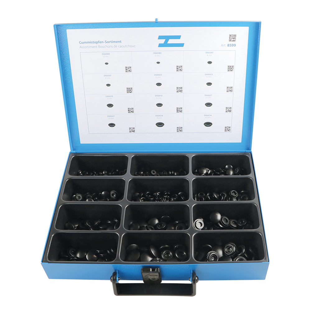 Sortiment Gummistopfen im Metallkoffer mit 12 Fächern. Inhalt: 450 assortierte Stopfen ø 6 / 8 / 10 / 12 /...