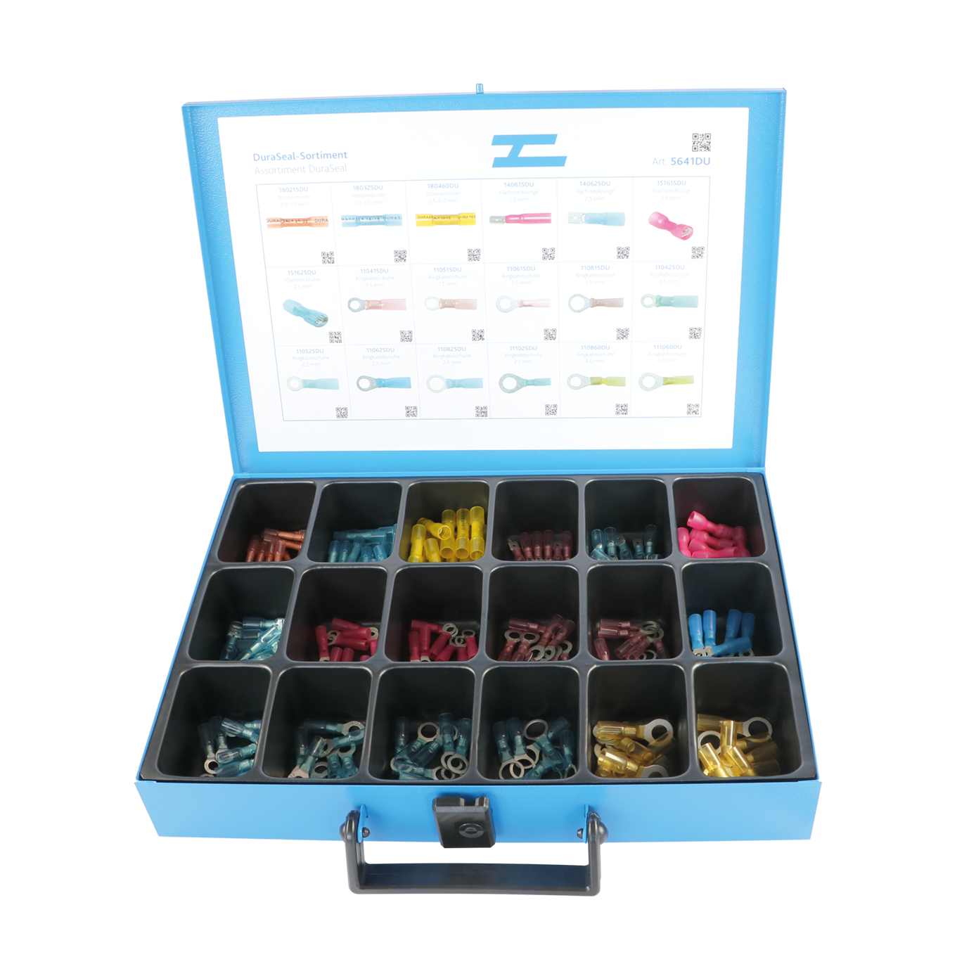 Sortiment Wärmeschrumpf-Verbinder/-Kabelschuhe DURASEAL im Metallkoffer mit 18 Fächern. Inhalt: 210 Stk assortierte Verbinder: 60 Stk Stossverbinder 1mm2...6mm2 20 Stk Schrumpf-Flachsteckzungen...