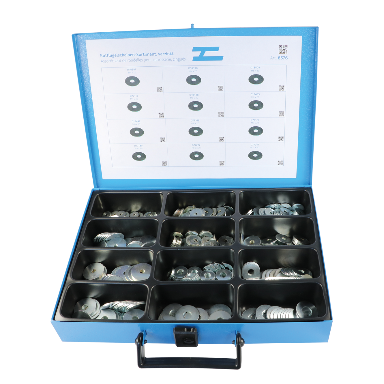 Sortiment Kotflügelscheiben im Metallkoffer mit 12 Fächern, Inhalt: 800 assortierte Scheiben in den Grössen: 4x15 - 12x30 galvanisch verzinktAbmessungen330x230x54mmGarantie2 Jahre