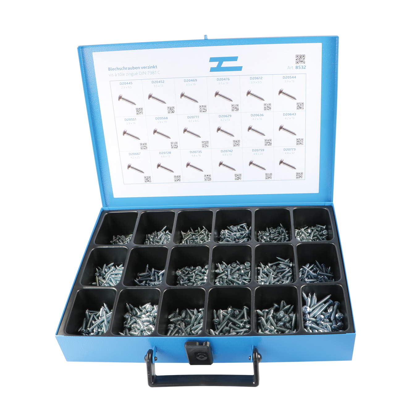 Sortiment Linsen-Blechschrauben mit Kreuzschlitz im Metallkoffer mit 18 Fächern, Inhalt: 1’500 assortierte Linsen-Blechschrauben DIN 7981-C-H in den Grössen: 2.9x9.5 -...