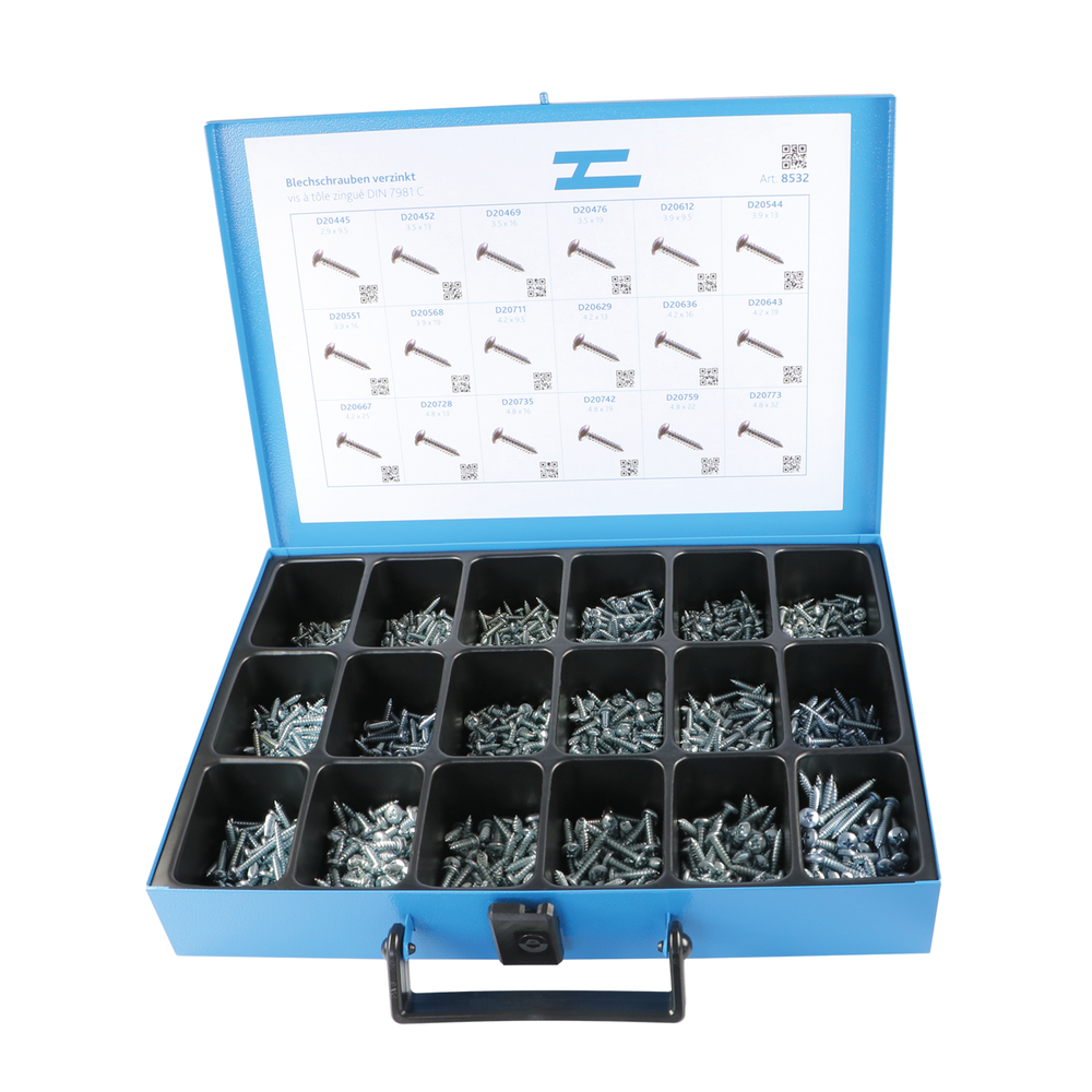 Inhalt: 1’500 assortierte Linsen-Blechschrauben DIN 7981-C-H in den Grössen: 2.9x9.5 - 4.8x32