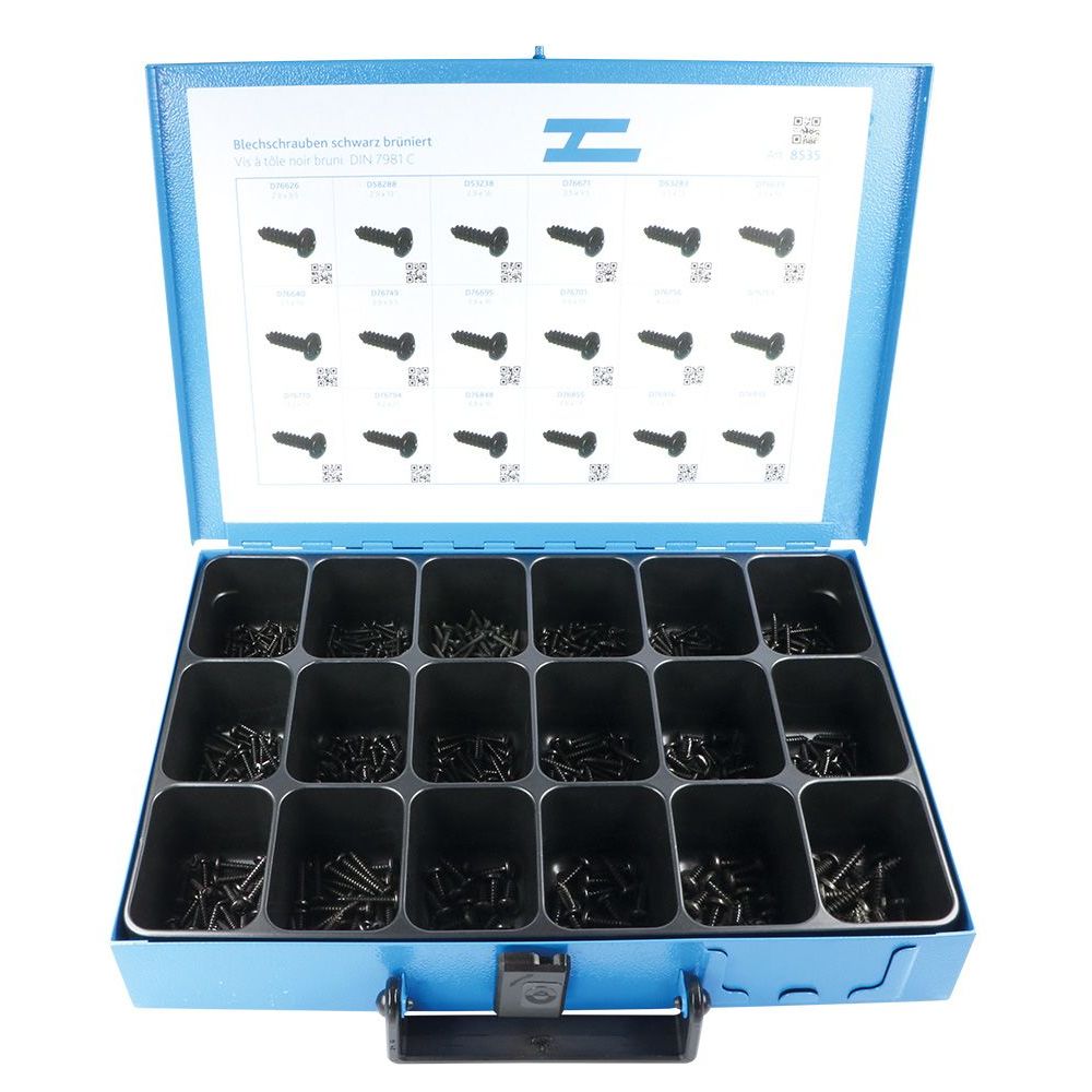 Sortiment Linsen-Blechschrauben mit Kreuzschlitz im Metallkoffer mit 18 Fächern, Inhalt: 720 assortierte Linsen-Blechschrauben DIN 7981-C-H in den Grössen: 2.9x9.5 -...