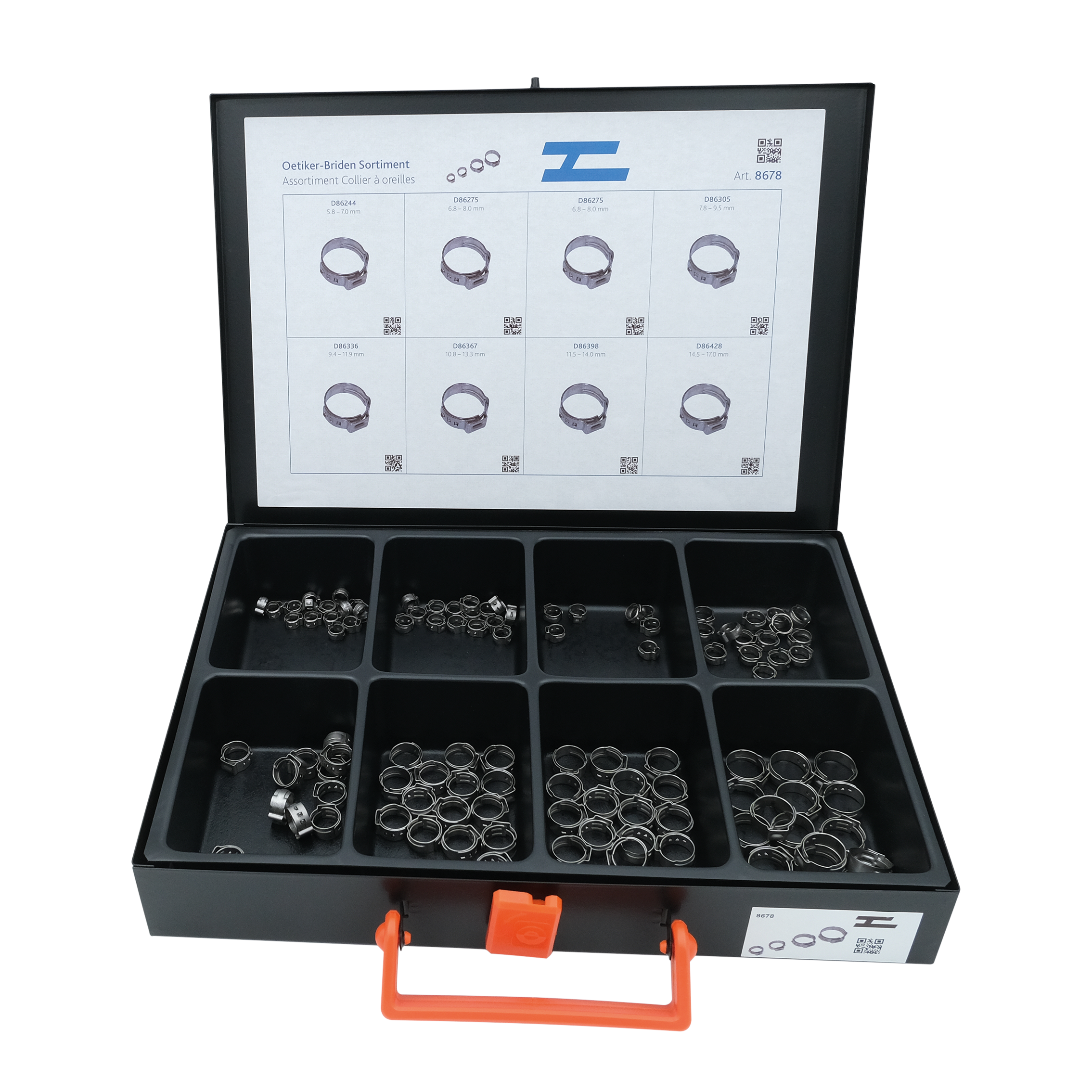 Sortiment Oetiker-Briden/stufenlose 1 Ohr-Klemmen im Metallkoffer mit 8 Fächern. Inhalt: 120 assortierte Schellen in den Grössen ø5,8-7,0mm...ø14,5- 17,0mm Edelstahl (rostfrei)Abmessungen330x230x54mmGarantie2...