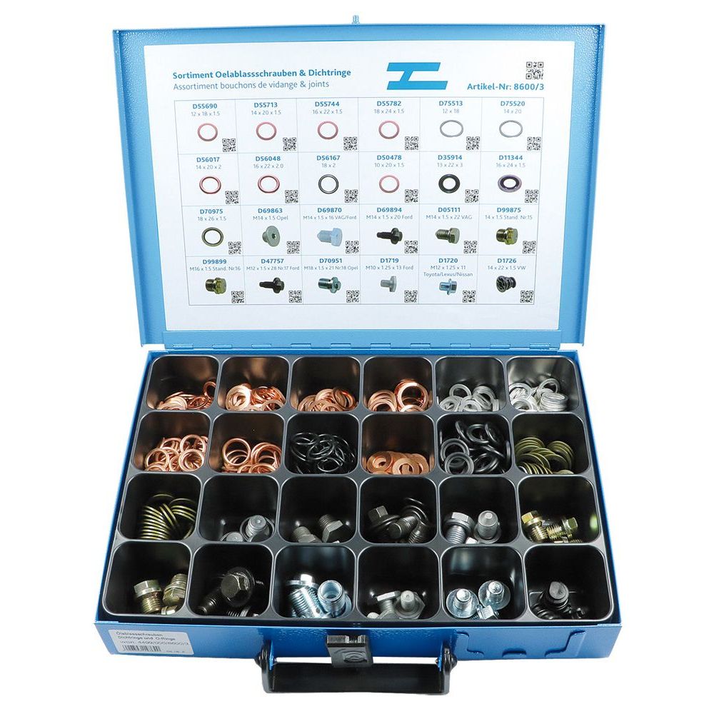 Sortiment Oelablassschrauben & Dichtringe im Metallkoffer mit 24 Fächern. Inhalt: • 175 Dichtringe Kupfer massiv DIN 7603 A • 75...