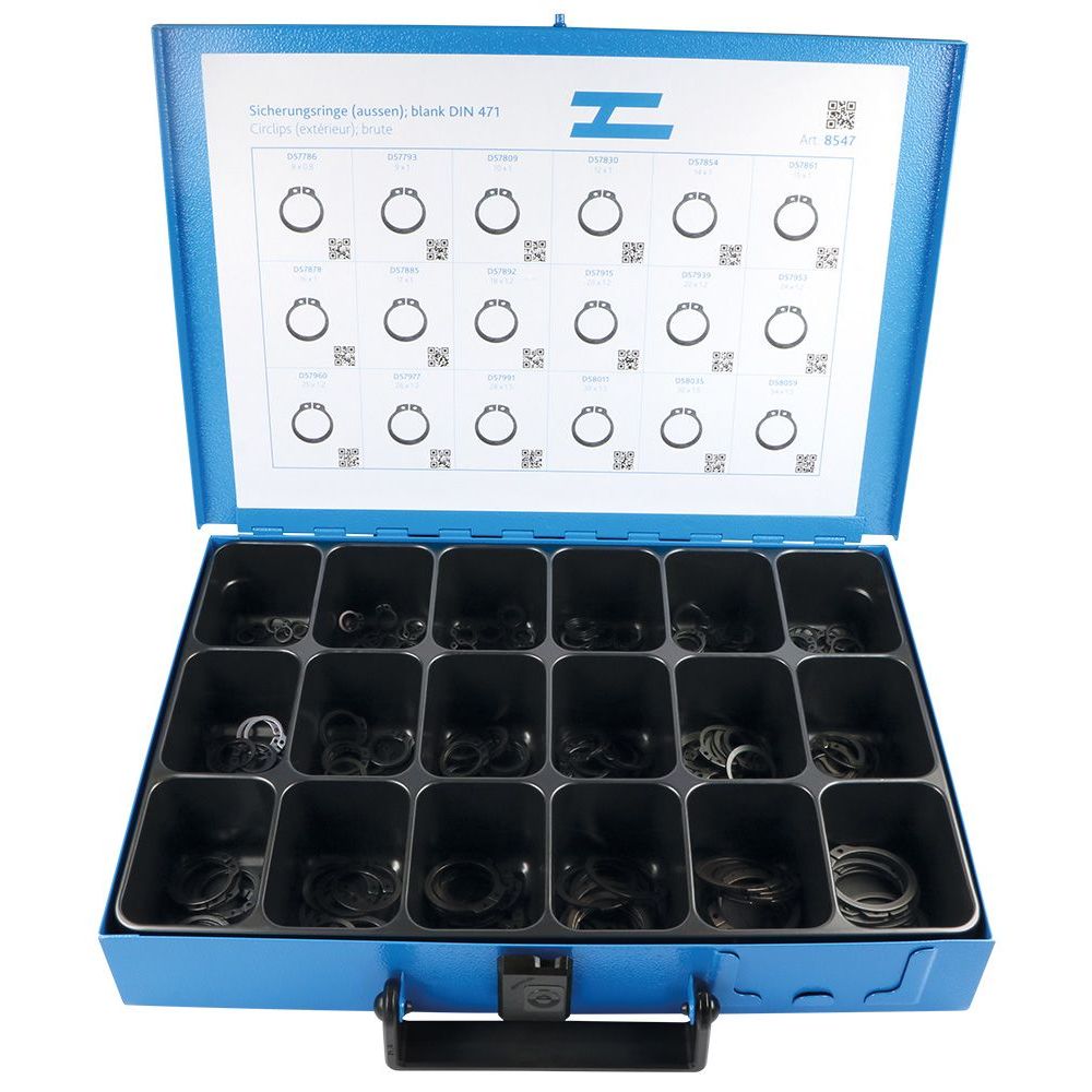 Sortiment Sicherungsringe für Wellen (aussen) DIN 471 im Metallkoffer mit 18 Fächern. Inhalt: 180 assortierte Seeger-Ringe in den Grössen ø8x0.8...