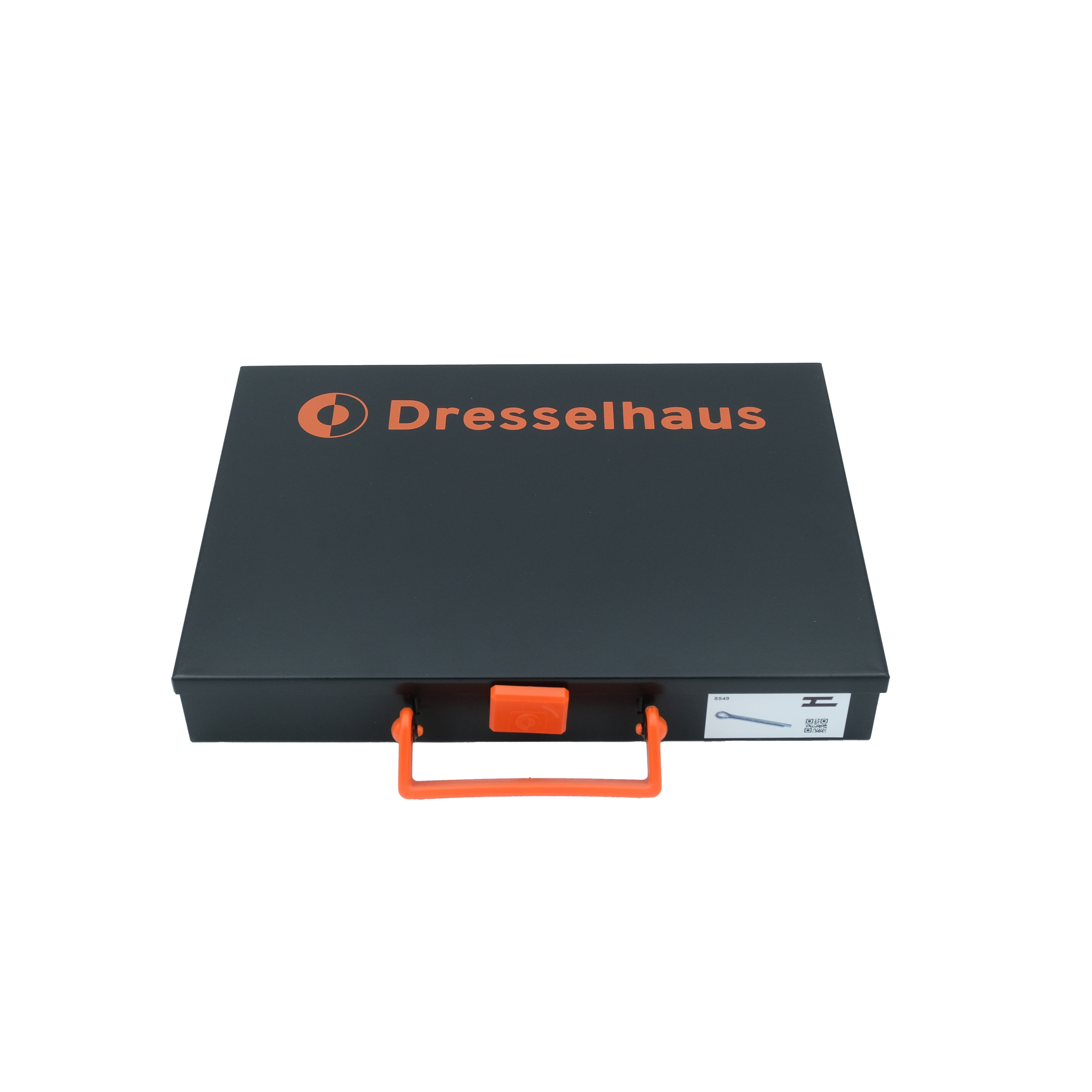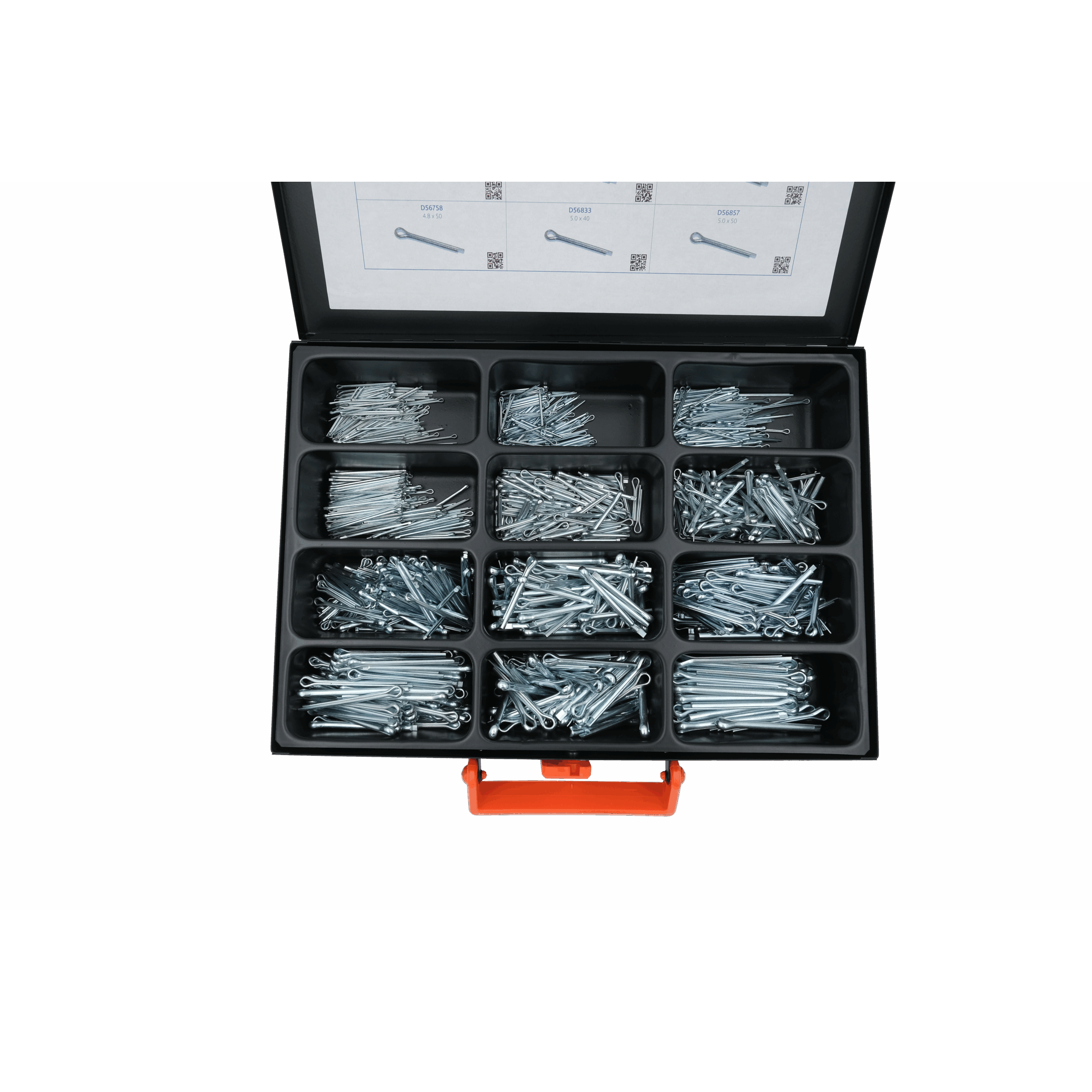 Sortiment Stahl-Splinten im Metallkoffer mit 12 Fächern. Inhalt: 1’100 assortierte Splinten in den Grössen 1.6x32 - 5x50 galvanisch verzinktAbmessungen330x230x54mmGarantie2 Jahre