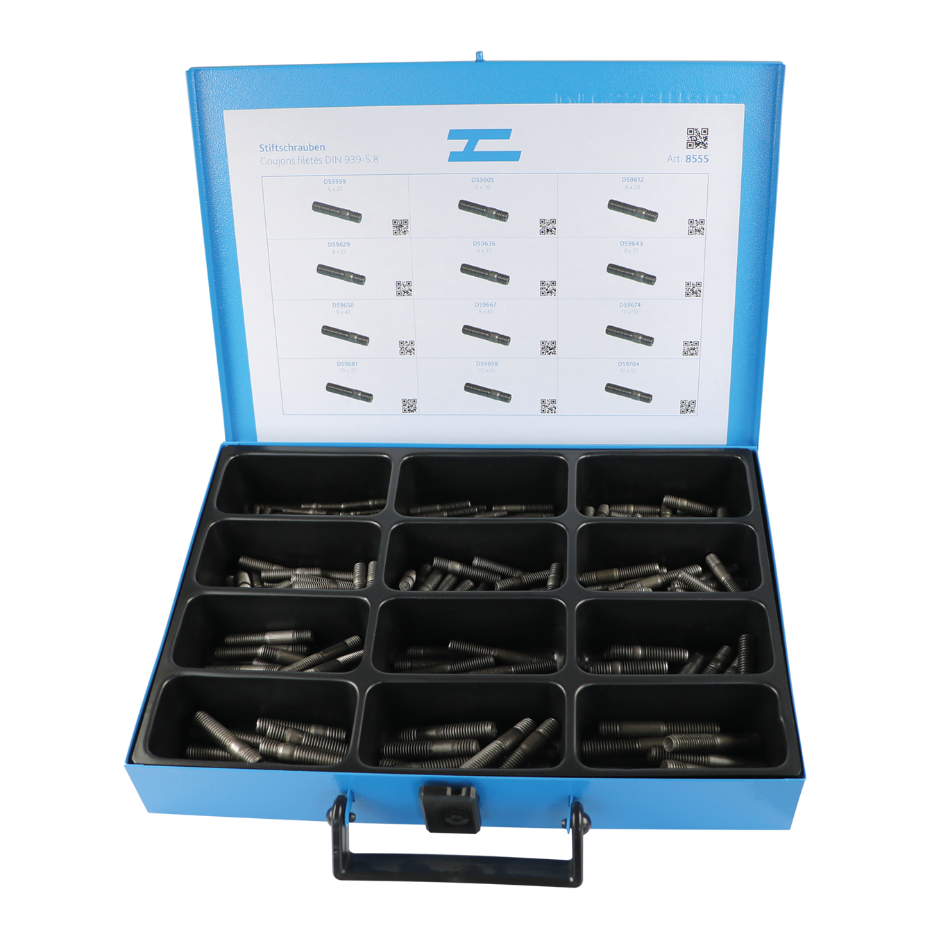 Sortiment Stiftschrauben/Stehbolzen im Metallkoffer mit 12 Fächern, Inhalt: 195 assortierte Schrauben DIN 939 in den Grössen: M6x20 - M10x50 geschwärzt...