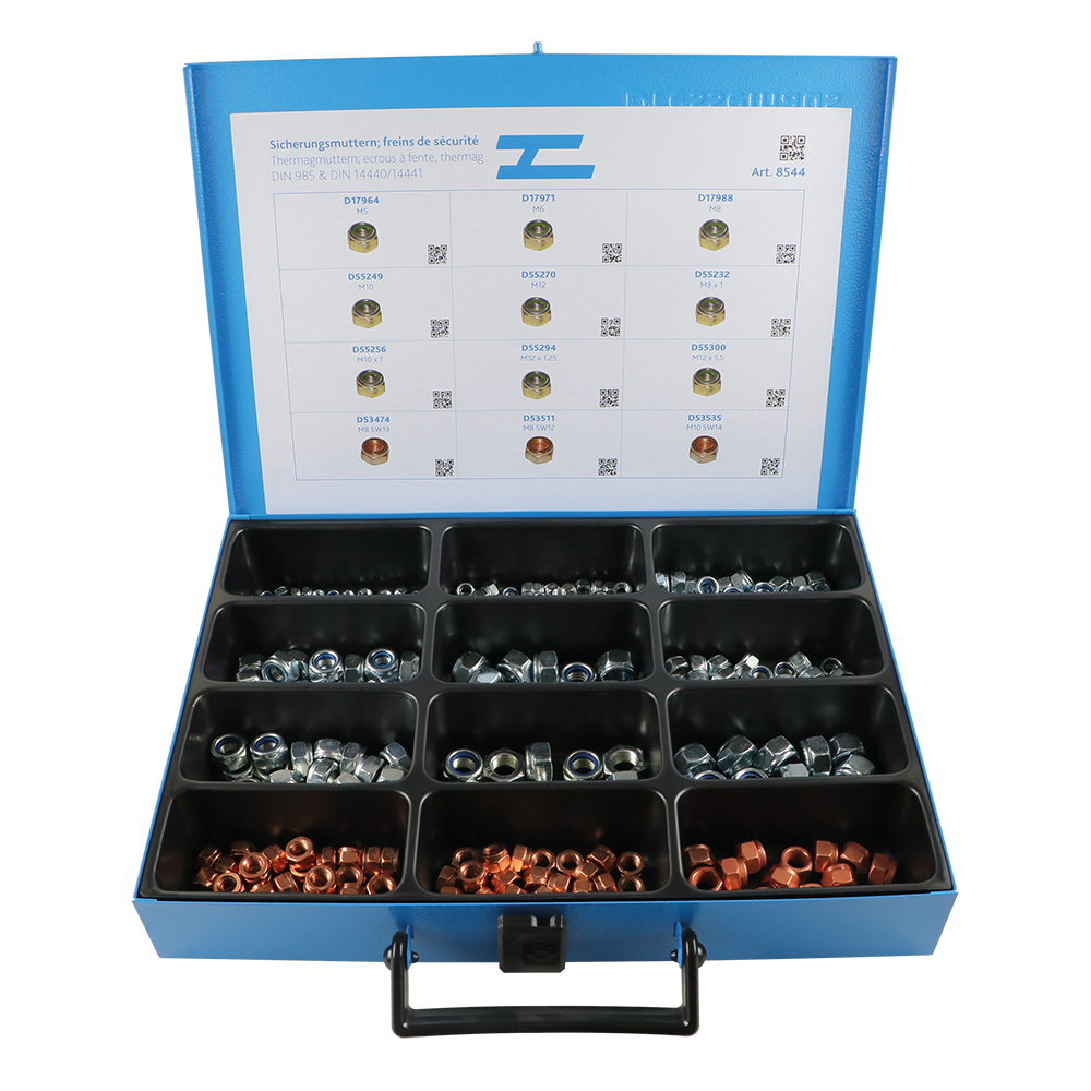 Sortiment Stopp- & Schlitzmuttern im Metallkoffer mit 12 Fächern Inhalt: 325 assortierte Muttern DIN 985/14440 in den Grössen: M5-M12 &...