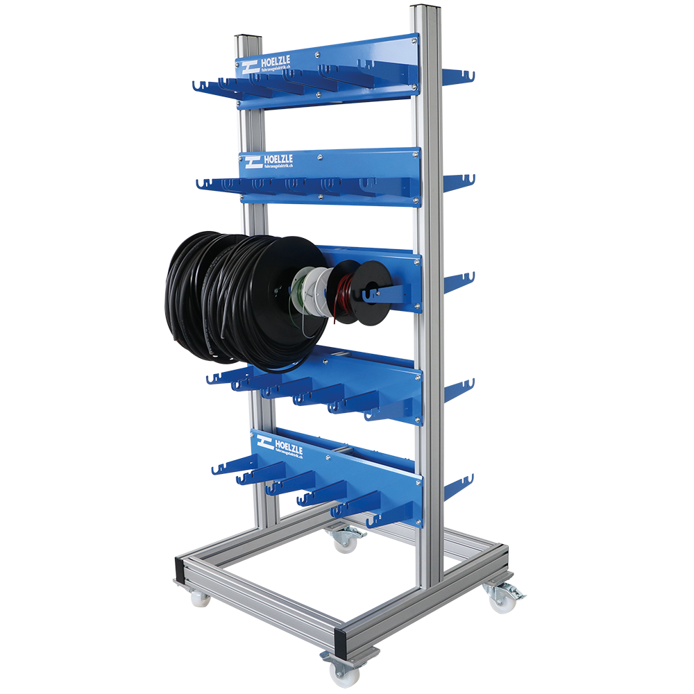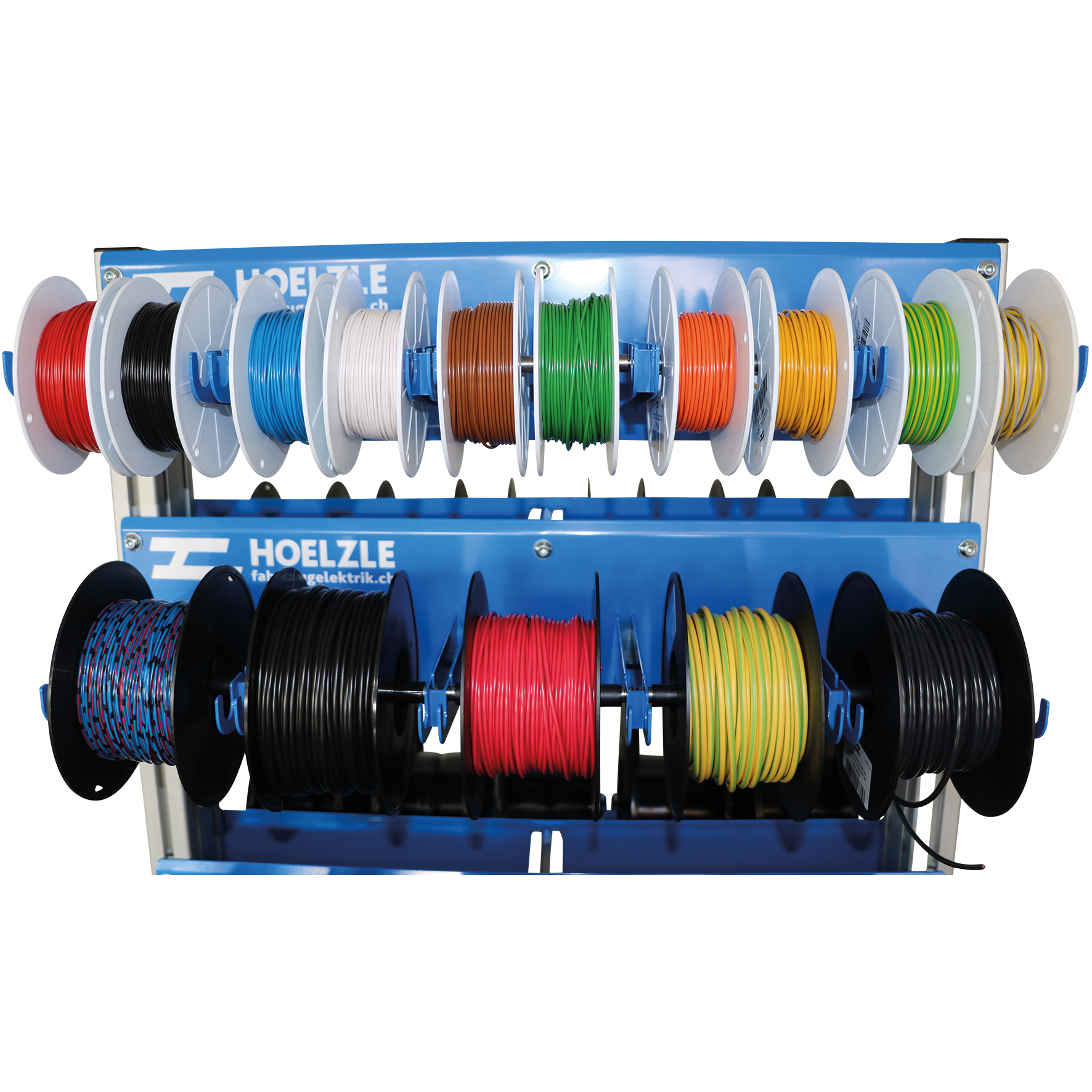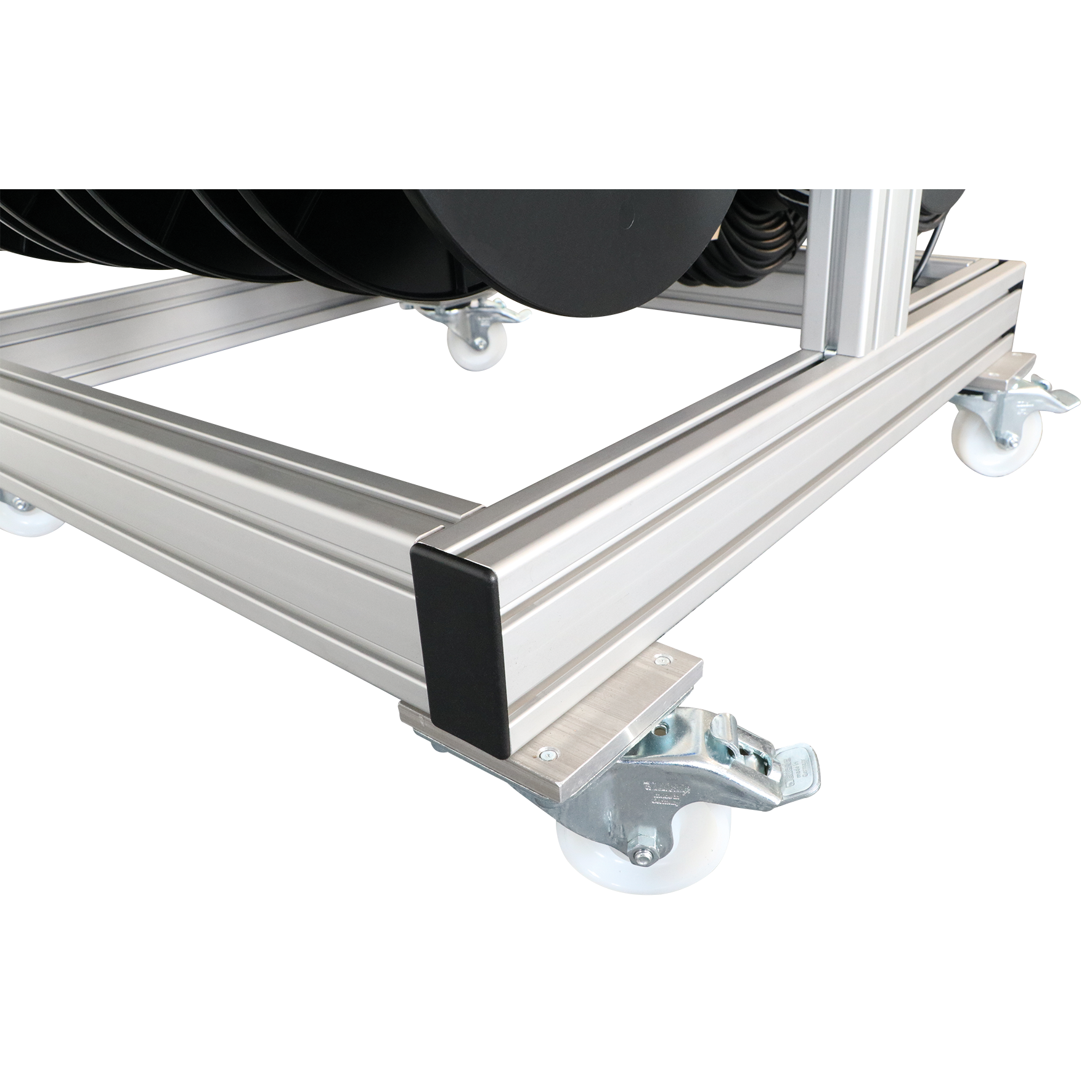 - Der Spulenwagen ist in der Lage, bis zu 10 (5 pro Seite) Kabelabrollvorrichtungen (Art-nr. 30051) aufzunehmen, d. h. Sie haben mit nur einem einzigen Spulenwagen auf kleinstem Raum bis zu 50 Achsen zur Verfügung, die je mit einer teilbaren Spule, einer SGF-Spule oder zwei AYL-Spulen bestückt werden können.