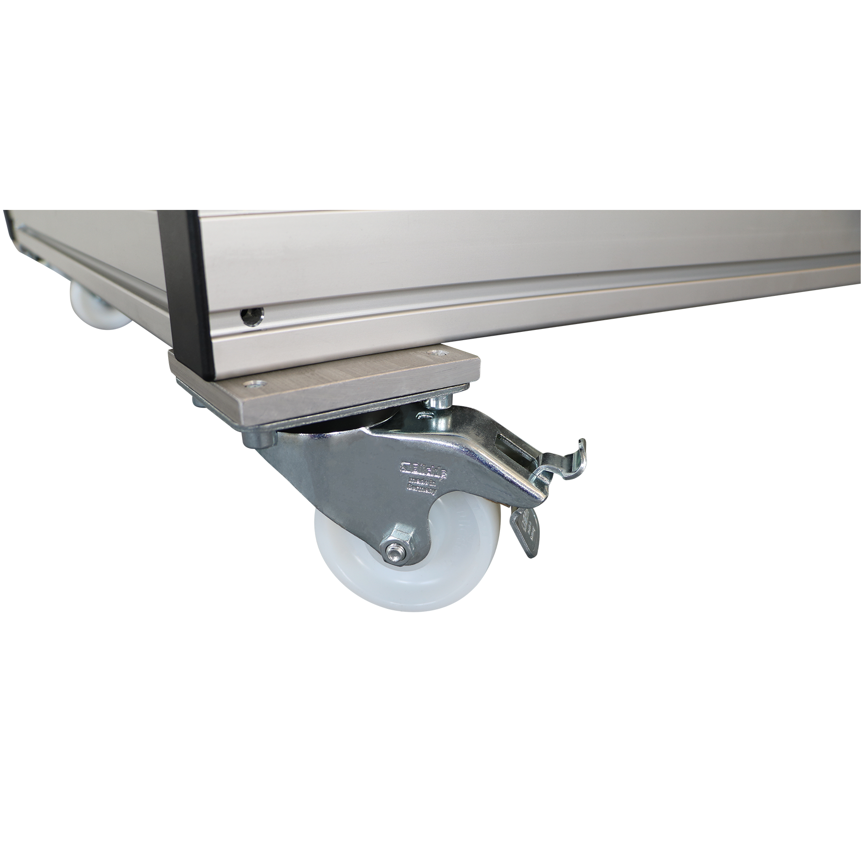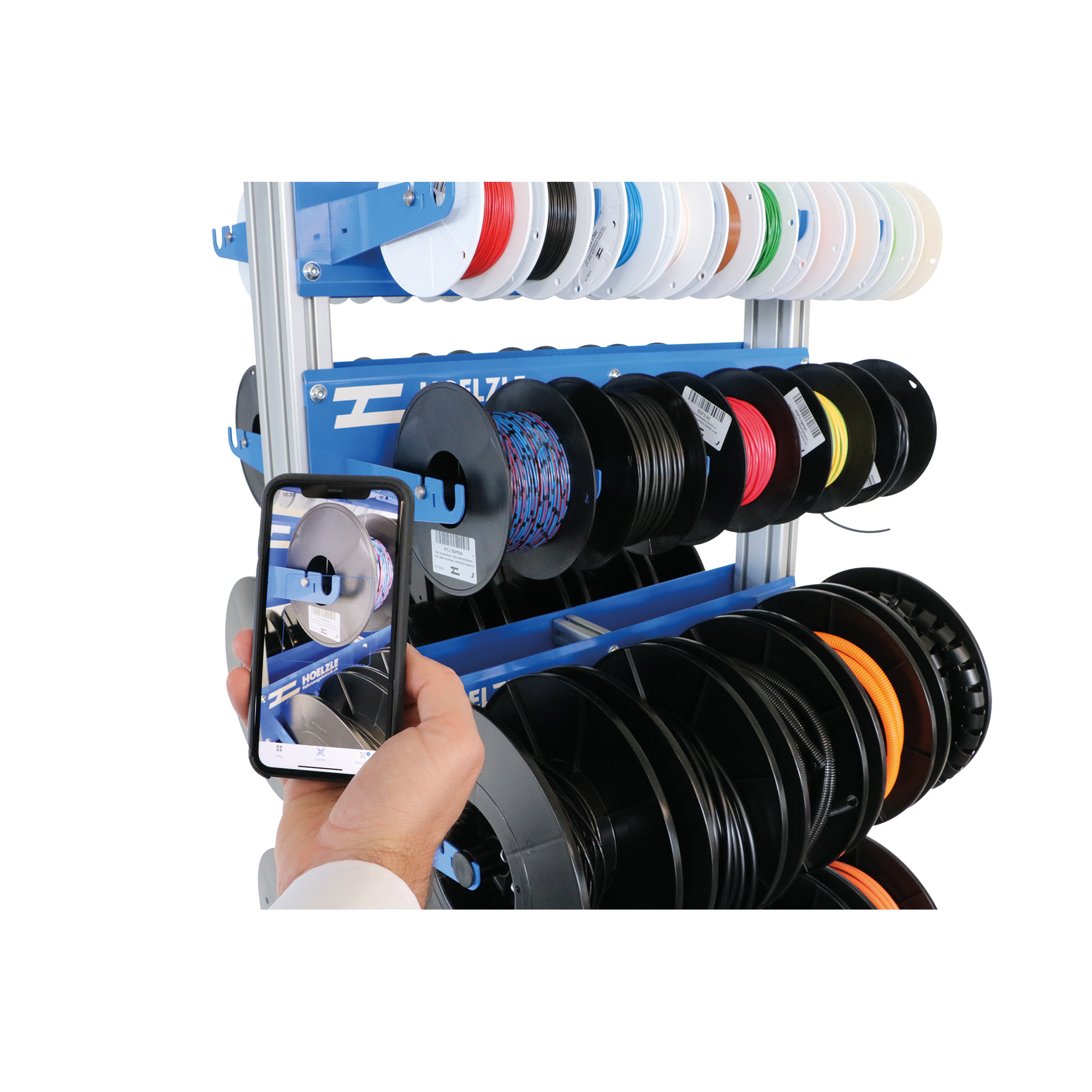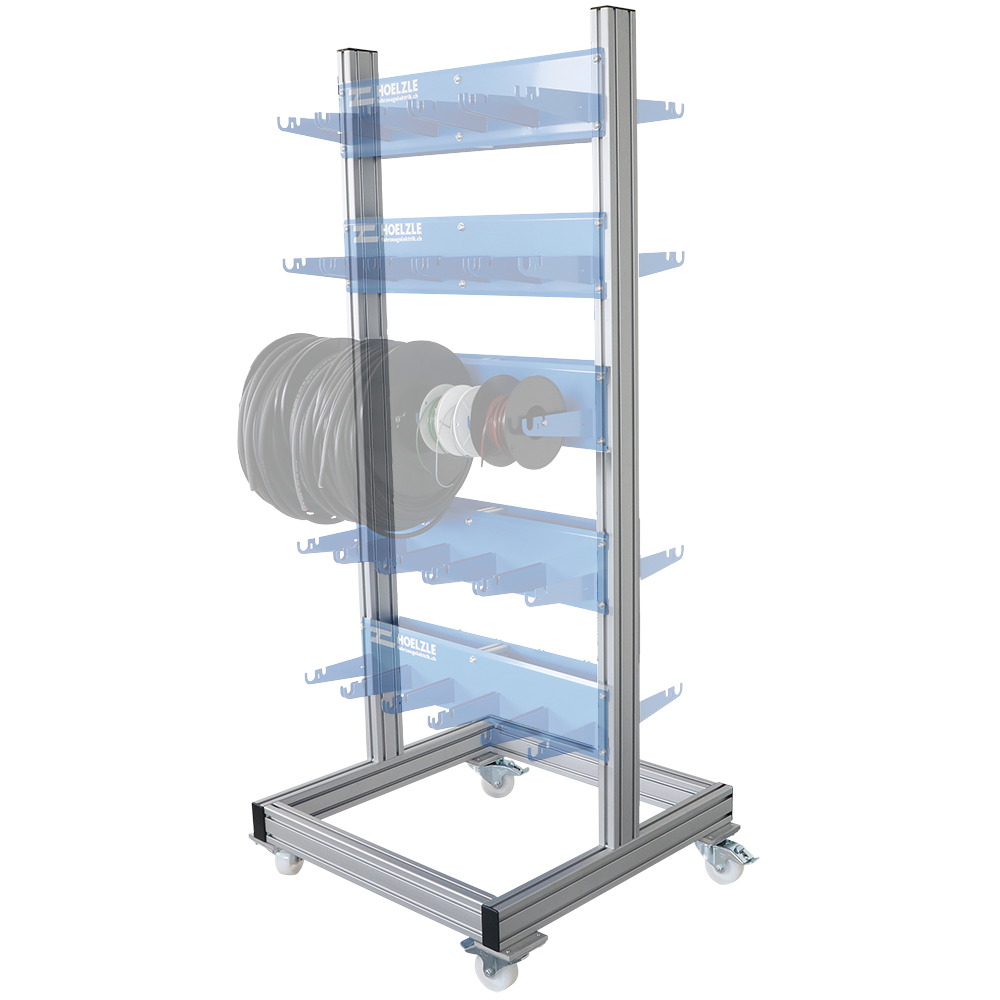 - Der Spulenwagen ist in der Lage, bis zu 10 (5 pro Seite) Kabelabrollvorrichtungen (Art-nr. 30051) aufzunehmen, d. h. Sie haben mit nur einem einzigen Spulenwagen auf kleinstem Raum bis zu 50 Achsen zur Verfügung, die je mit einer teilbaren Spule, einer SGF-Spule oder zwei AYL-Spulen bestückt werden können.