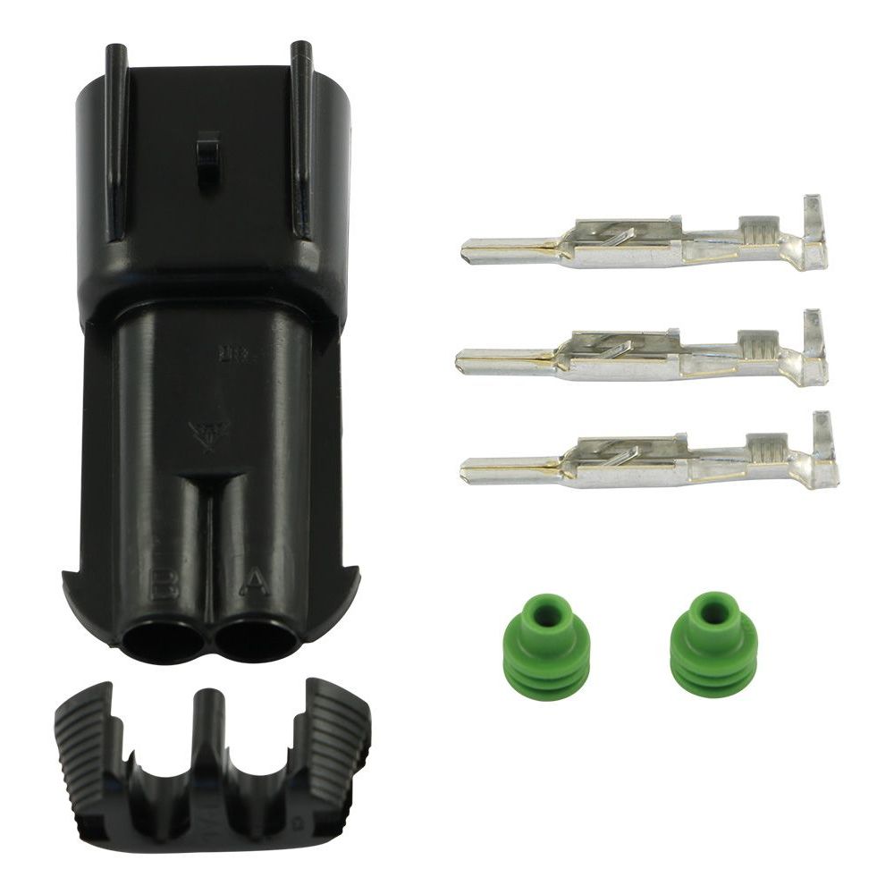 Stecker-Set Delphi Metri-Pack 280, 2polig, weiblich, 1.5mm2 mit Zugentlastung, bestehend aus: 1x Steckergehäuse (schwarz) 3x Flachstecker (m) 1.5mm2 2x Gummidichtung...
