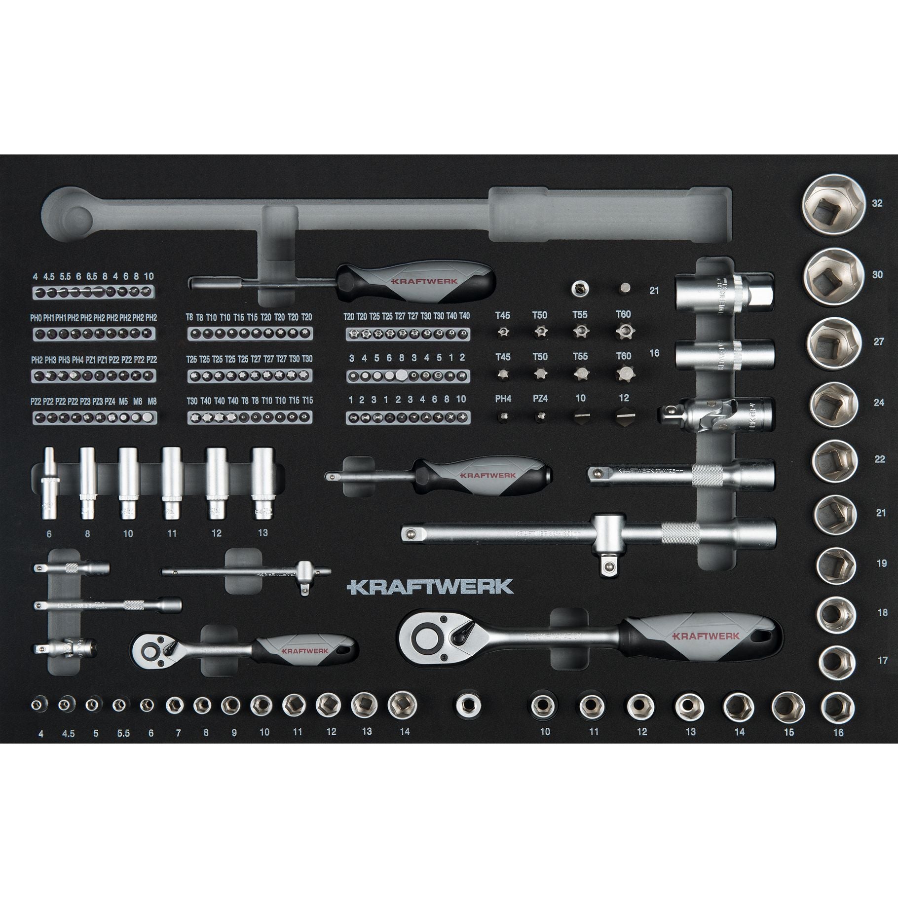 1/2 Steckschlüsseleinsätze: 10 – 11 – 12 – 13 – 14 – 15 – 16 – 17 – 18 – 19 – 21 – 22 – 14 – 27 – 30 - 32 mm