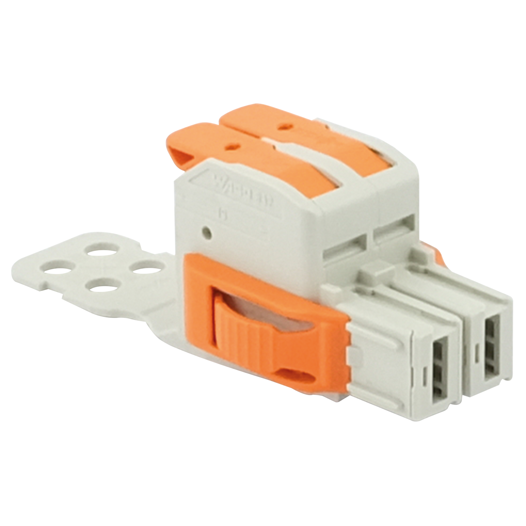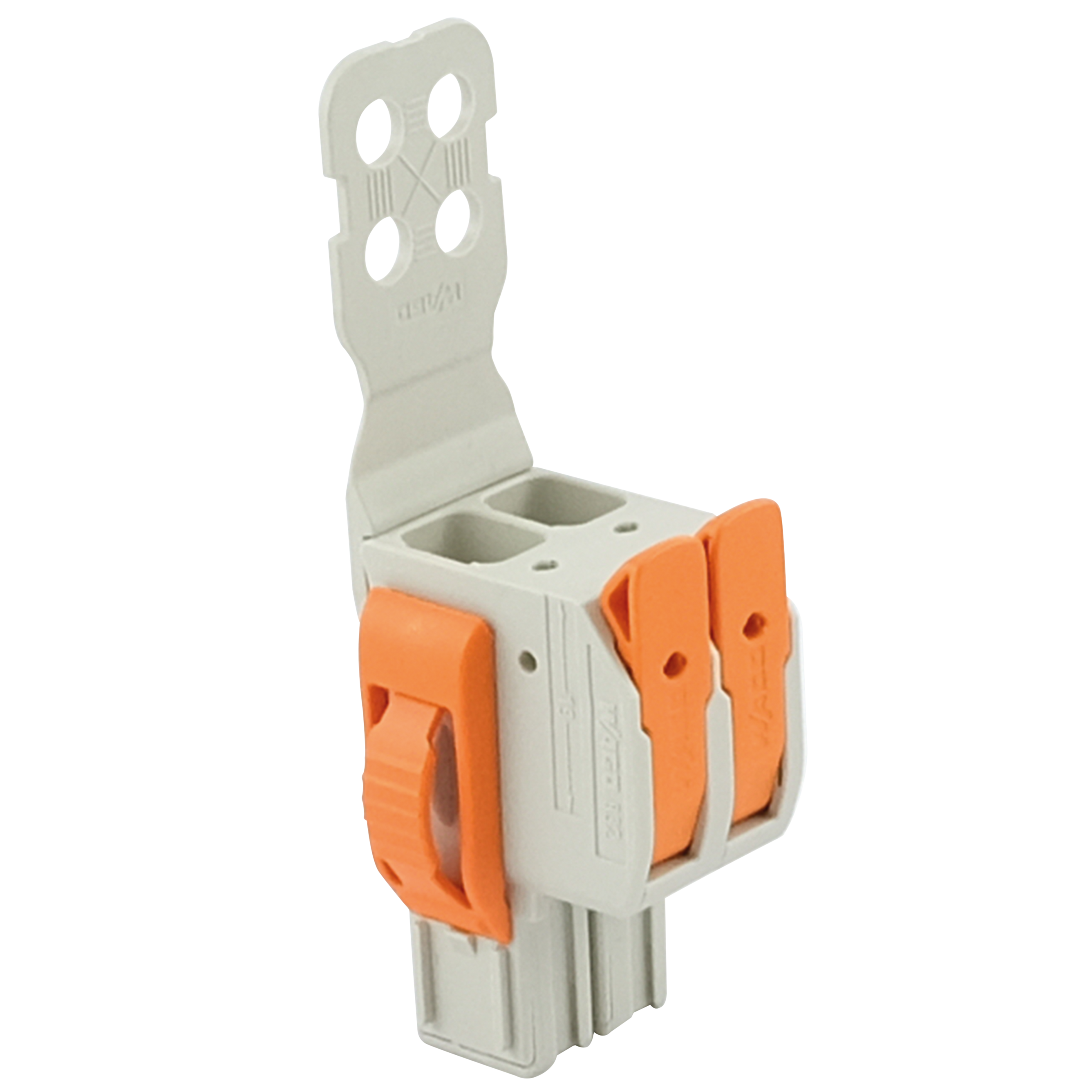 - 2er-Leiterklemme mit Betätigungshebeln WAGO CAGE CLAMP® - versilberte Kontakte - Klemmfederwerkstoff Chromnickelfederstahl - mit Befestigungsmöglichkeit/Kabelzugentlastung - für Kabel mit...