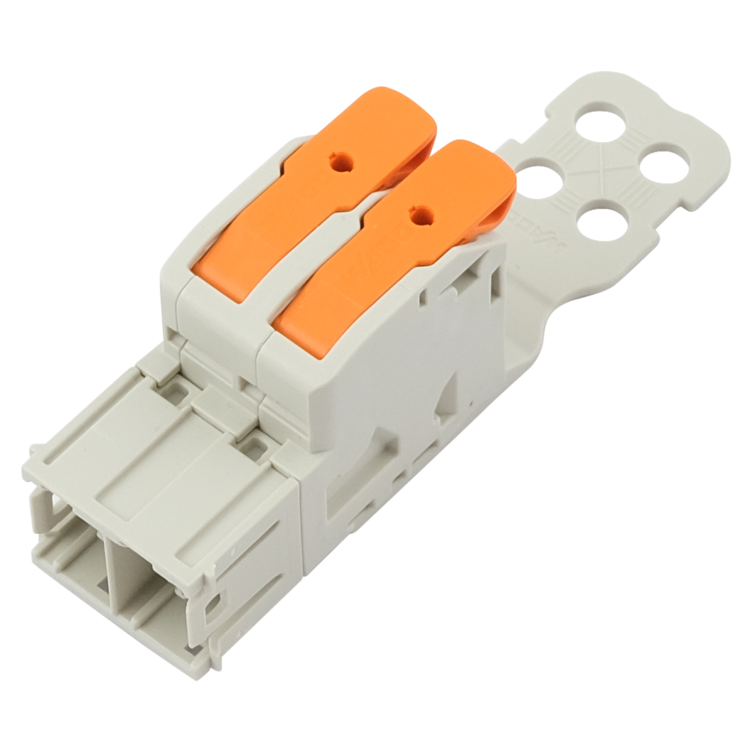 - 2er-Leiterklemme mit Betätigungshebeln WAGO CAGE CLAMP® - versilberte Kontakte - Klemmfederwerkstoff Chromnickelfederstahl - mit Befestigungsmöglichkeit/Kabelzugentlastung - für Kabel mit...