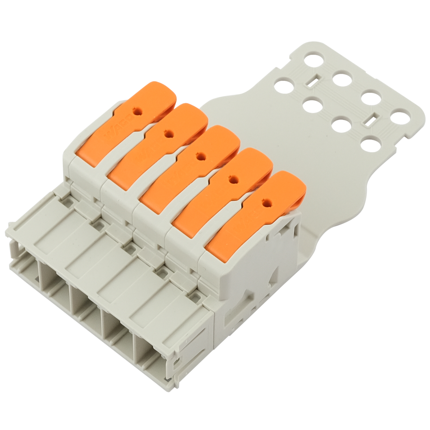 - 5er-Leiterklemme mit Betätigungshebeln WAGO CAGE CLAMP® - versilberte Kontakte - Klemmfederwerkstoff Chromnickelfederstahl - mit Befestigungsmöglichkeit/Kabelzugentlastung - für Kabel mit...