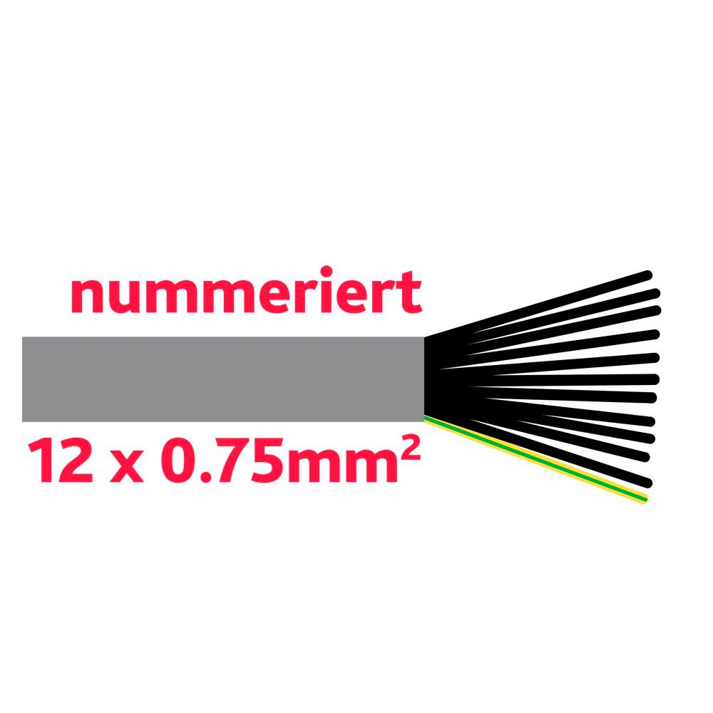 Adern schwarz, nummeriert + 1 Schutzleiter grün/gelbKabelquerschnitt12 x 0.75mm2Länge25mAussen-ø12.0mmTypFlex-JZ