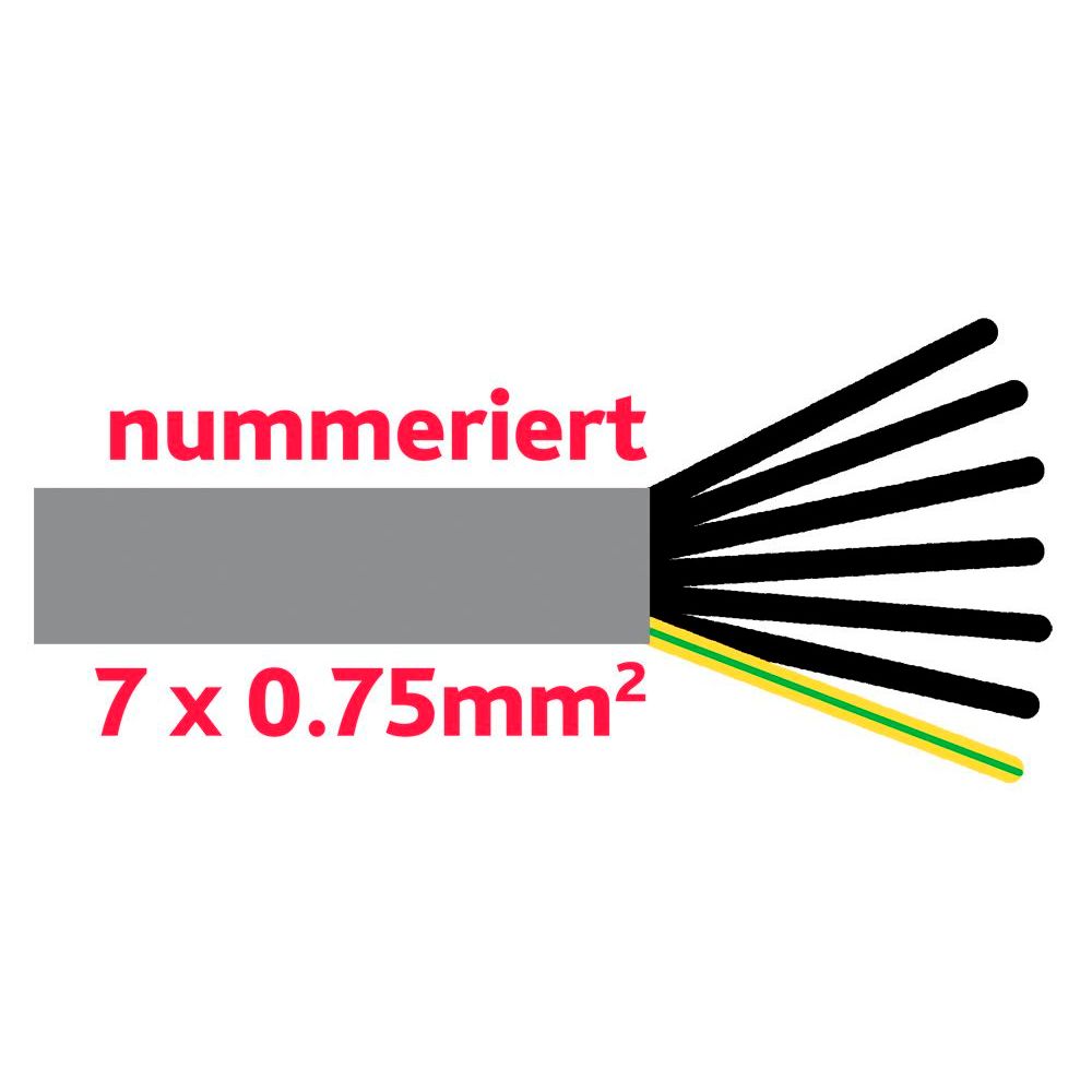 Adern schwarz, nummeriert + 1 Schutzleiter grün/gelbKabelquerschnitt7 x 0.75 mm2Länge25 mAussen-ø7.1 mmTypFlex-JZ