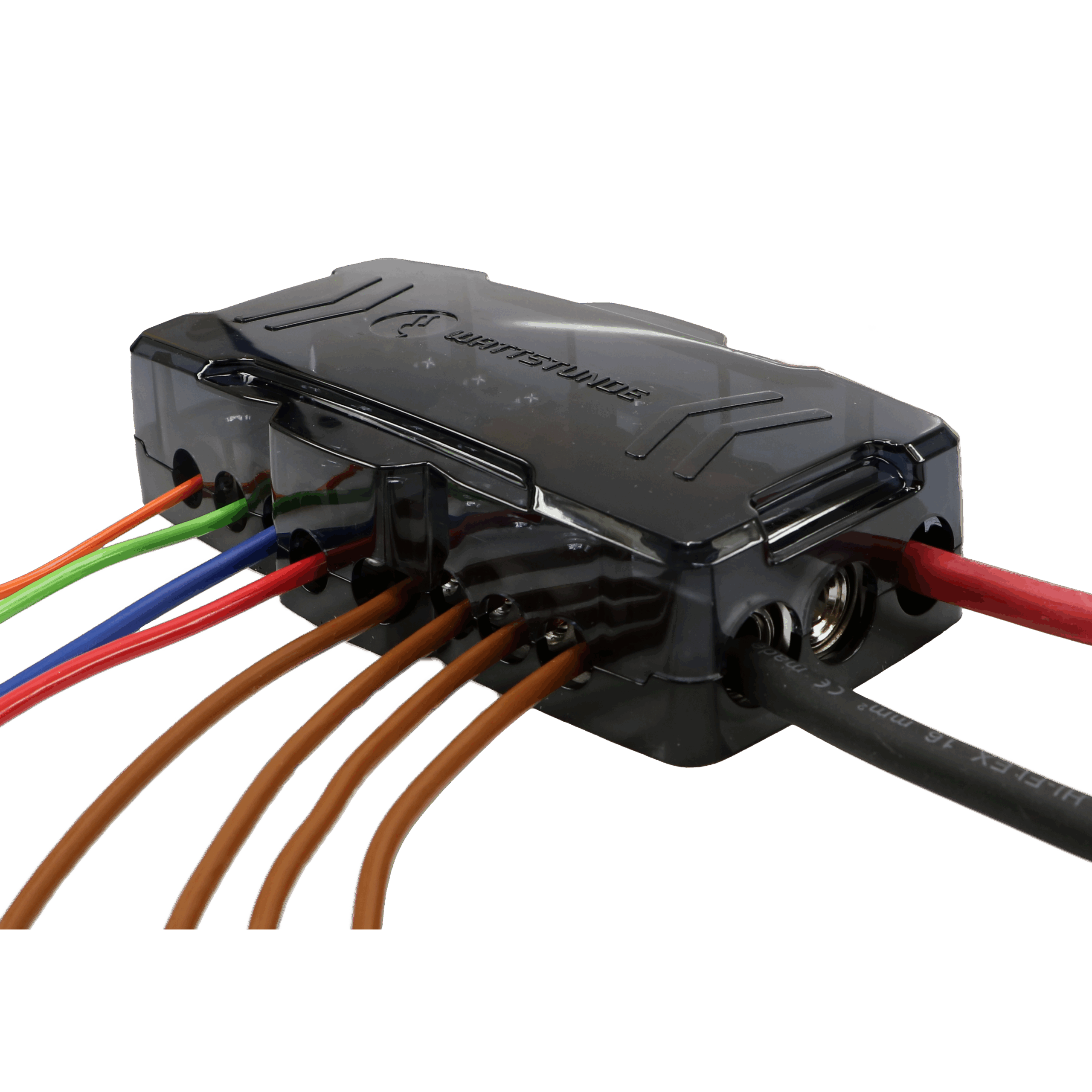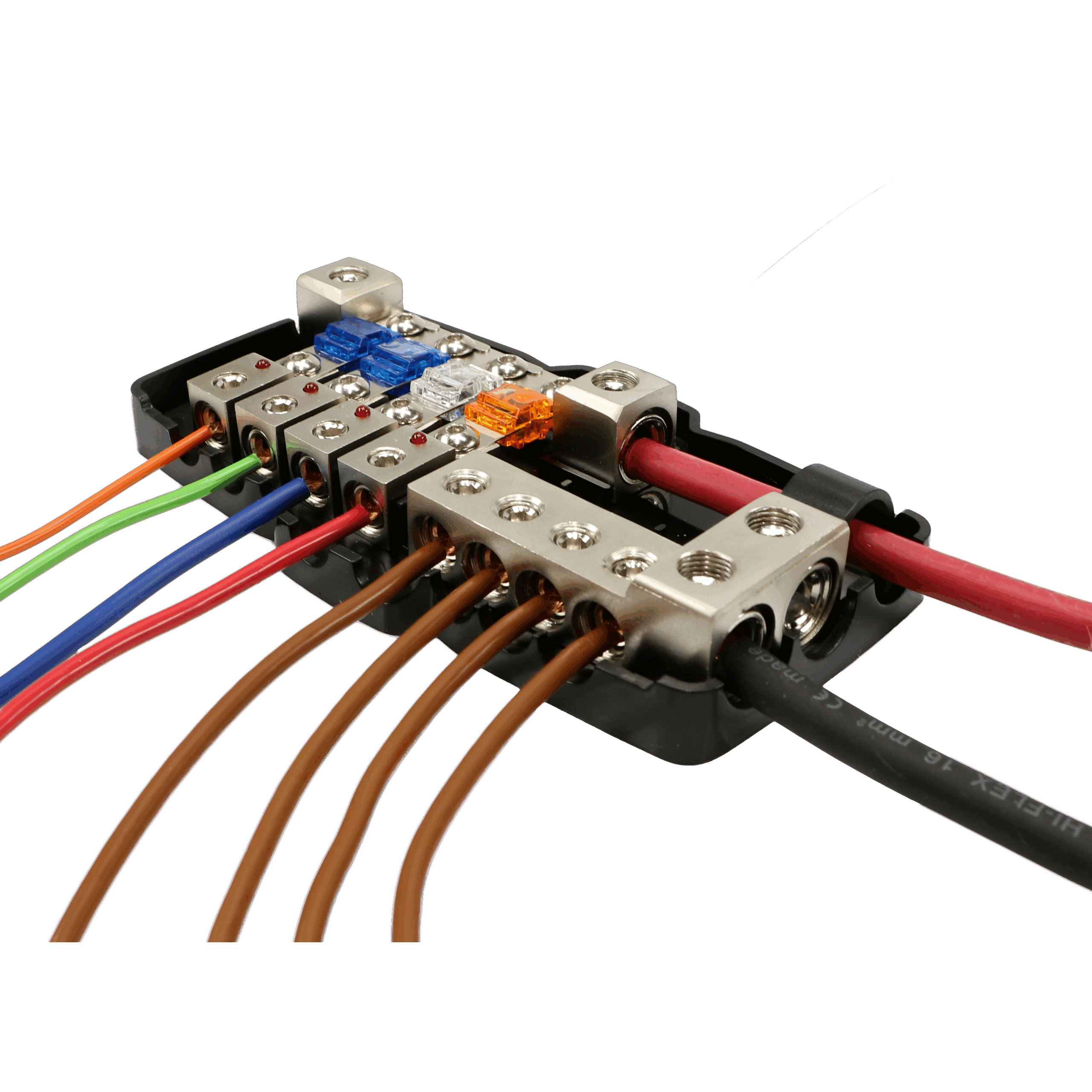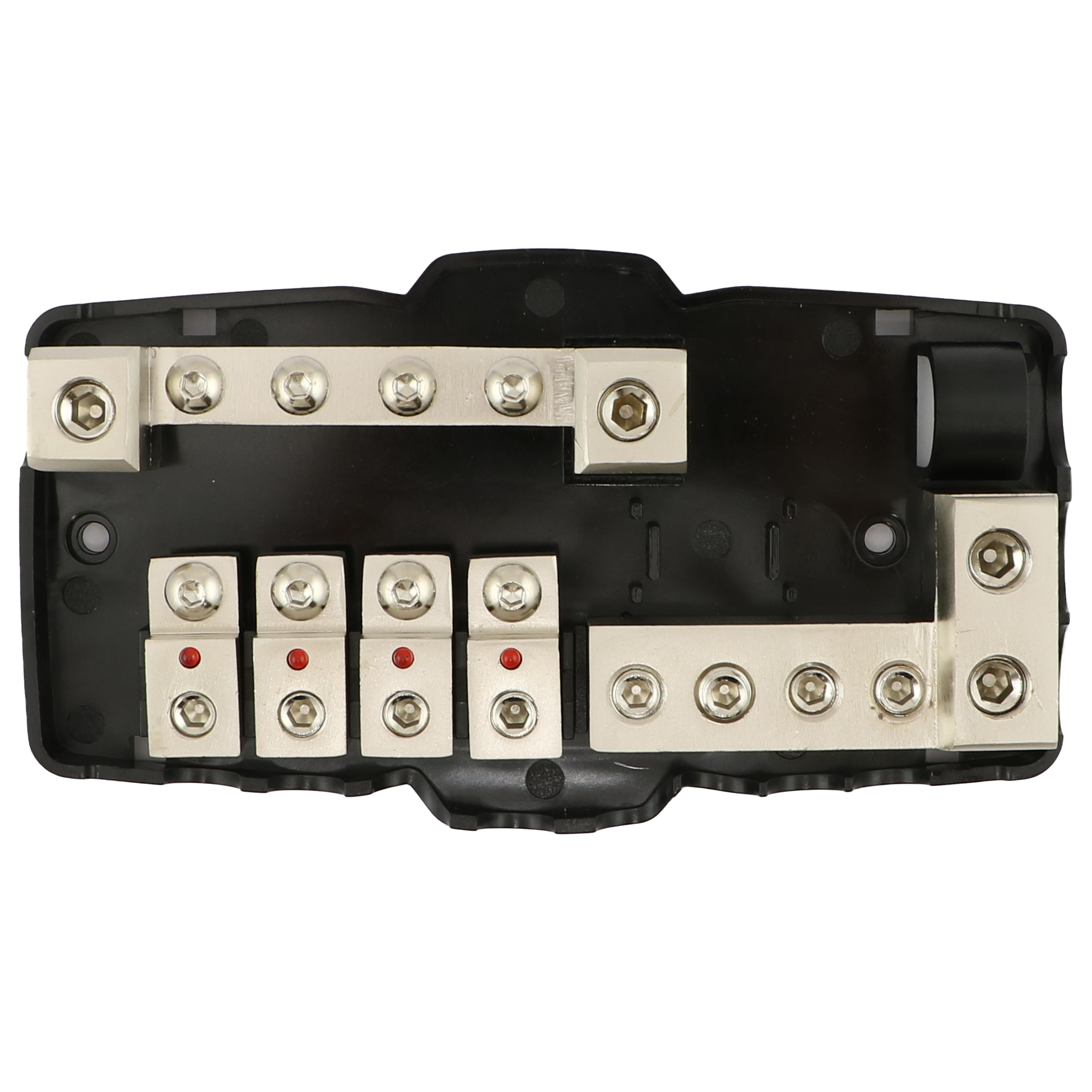 Leistungsstarker Stromkreisverteiler (Pluspol) für 4 Streifensicherungen/Stromkreisläufe und 4 Minusanschlüsse. Der Stromverteiler verfügt über 4 Kontroll-LED und einen durchsichtigen Deckel, der die Sichtung der Kontrollleuchten ermöglicht.