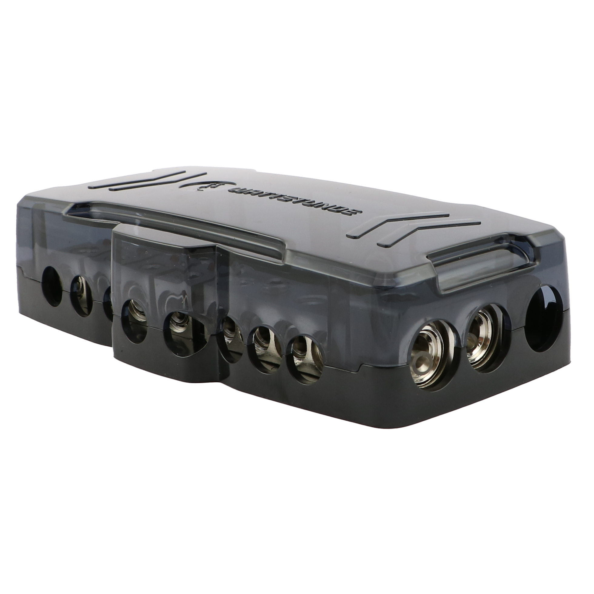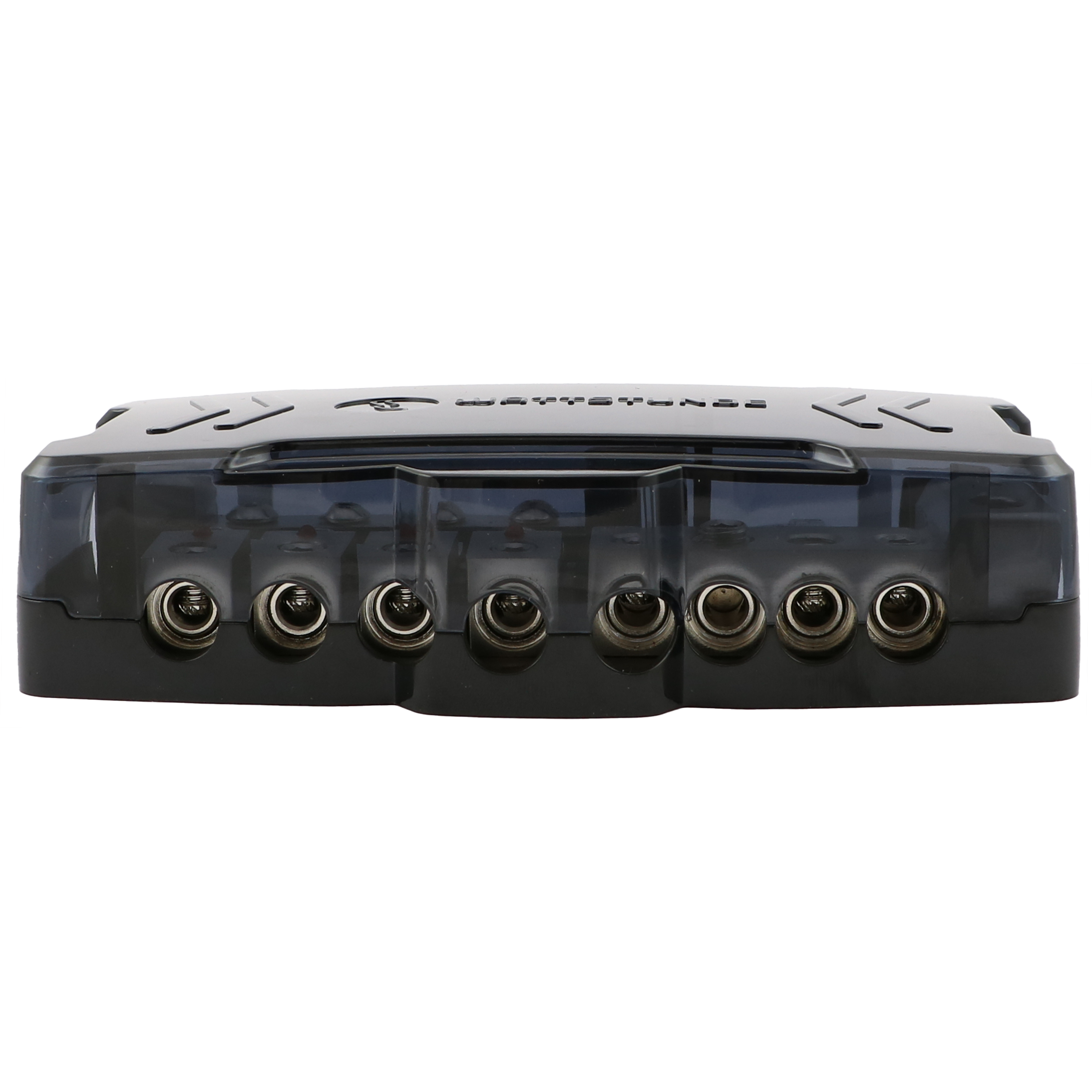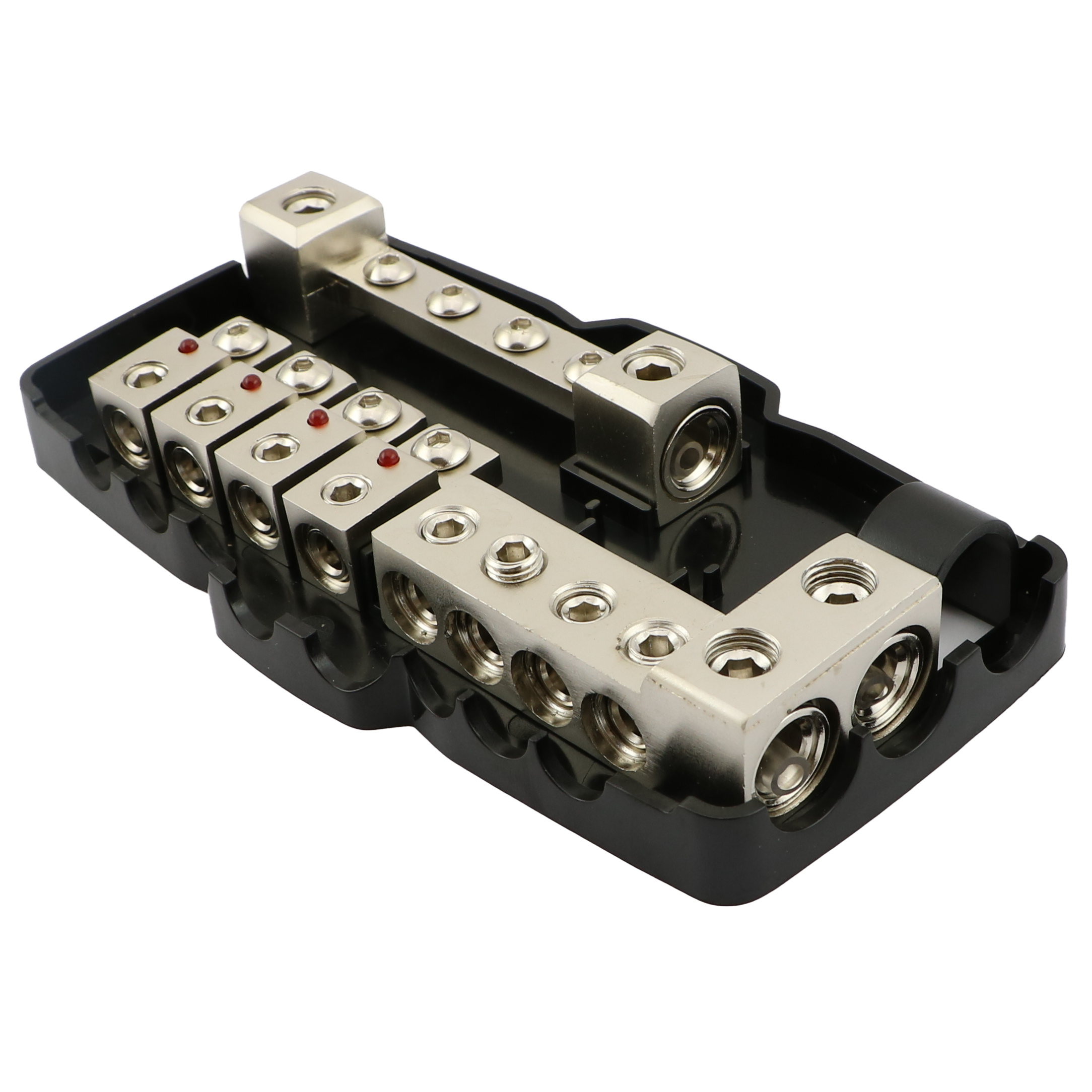 Leistungsstarker Stromkreisverteiler (Pluspol) für 4 Streifensicherungen/Stromkreisläufe und 4 Minusanschlüsse. Der Stromverteiler verfügt über 4 Kontroll-LED und einen durchsichtigen Deckel, der die Sichtung der Kontrollleuchten ermöglicht.
