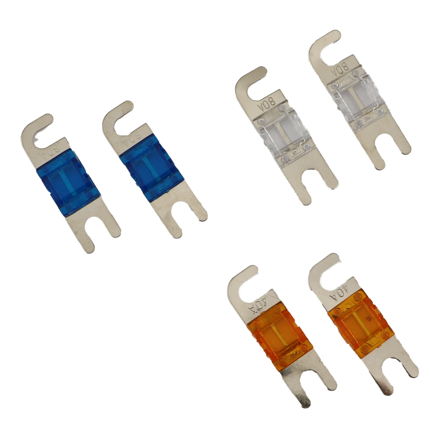 Inklusive einem Set mit 6 Streifensicherungen zum Festschrauben für 40, 60 und 80 Ampère und 80 Beschriftungsaufklebern (auf Englisch), um die einzelnen Stromzugänge zu markieren und Verwechslungen auszuschließen. Die vier Wandmontageschrauben sind ebenfalls in der Lieferung enthalten.