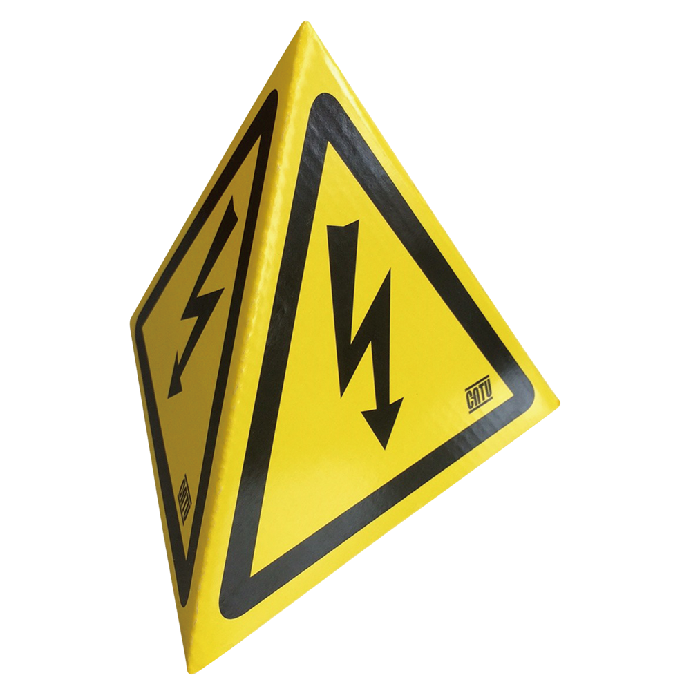 Pyramide „ACHTUNG SPANNUNG“. Aufdruck 3-seitig mit Magnetfuss, wird auf dem Fahrzeugdach platziert. Signal Warnung vor elektrischer Spannung gemäss DIN EN...