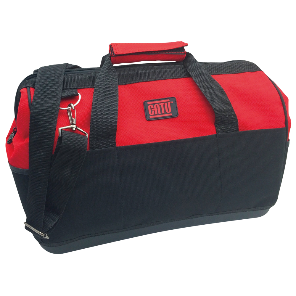 Aufbewahrungs- und Transporttasche zur sicheren Verstauung von Werkzeug und persönlicher Schutzausrüstung aus strapazierfähigem rotem und schwarzem Gewebe. Mehrere Innen- und...