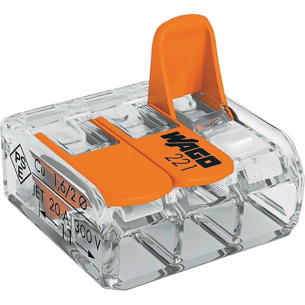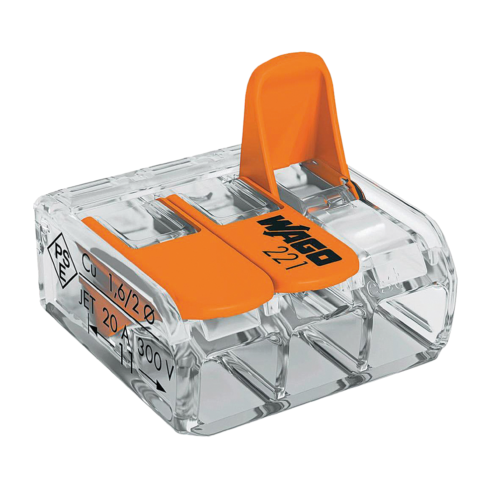 Max. 32 A, bis 85 °C, 3er-Leiterklemme mit Betätigungshebeln WAGO CAGE CLAMP® Anschluss, rostfreier ChromnickelfederstahlKabelquerschnitt0.14 - 4.0 mm2Abmessungen18.7 x 8.3...