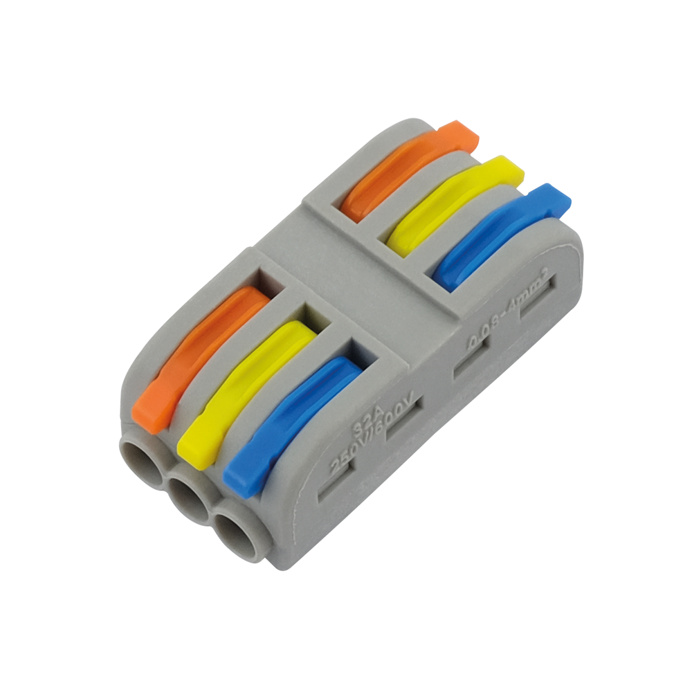 Beidseitig farbcodierte potential-getrennte Hebelklemmen zum einfachen Verlängern und Verzweigen von Leitungen.