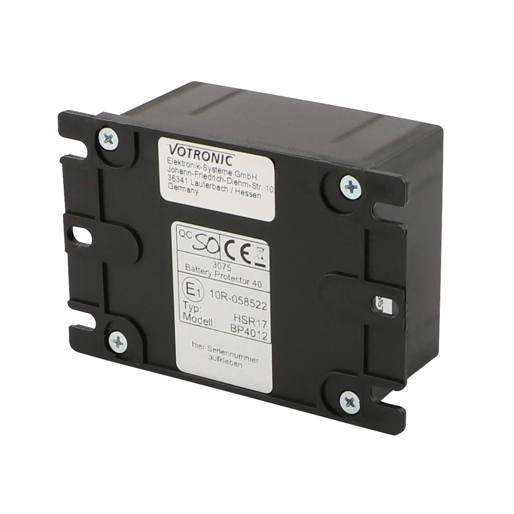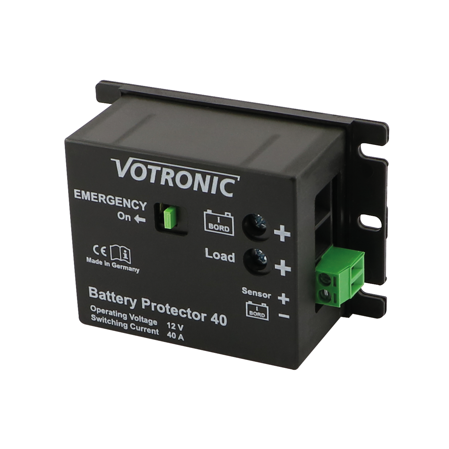 RelaisformSpezialrelaisSchaltfunktionSchliesserSpannung12 VLeistung maximal60 AmpèreLeistung Arbeitskontakt40 AmpèreParallelwiderstandNeinLöschdiodeNeinSicherungNeinAnschluss 30 seitlichNeinDauerstromJaWasserdichtNeinZusatzinformationDas Gerät Votronic Battery Protector 40 wird zwischen Versorgungsbatterie und Verbraucher geschaltet und ist für alle Bleibatterie-Typen (Säure, Gel, AGM) und -Fabrikate geeignet. Es schützt die Zweit-Batterie vor gefährlicher Tiefentladung sowie die Verbraucher und Ausrüstung vor Unter- und Überspannung und kann, von einem externen Schalter gesteuert, auch noch als fernbedienbarer Batterie-Hauptschalter dienen.