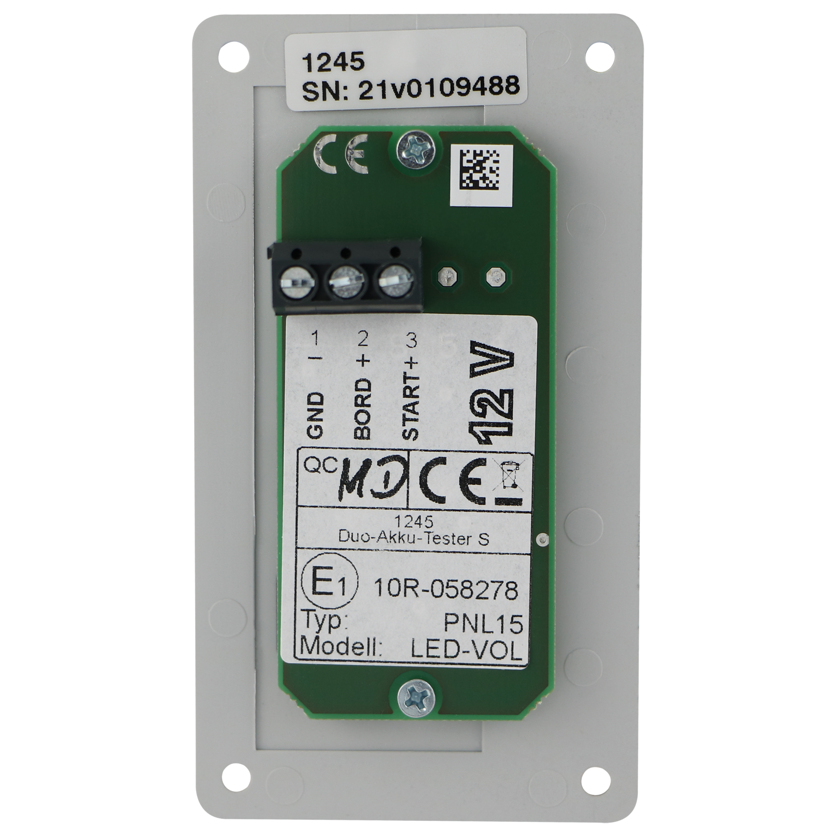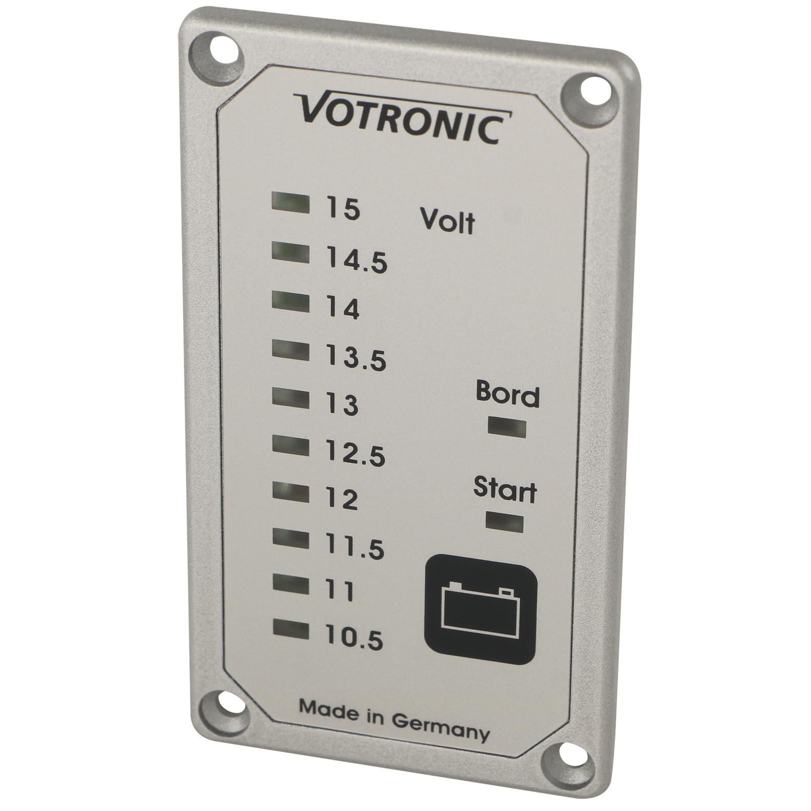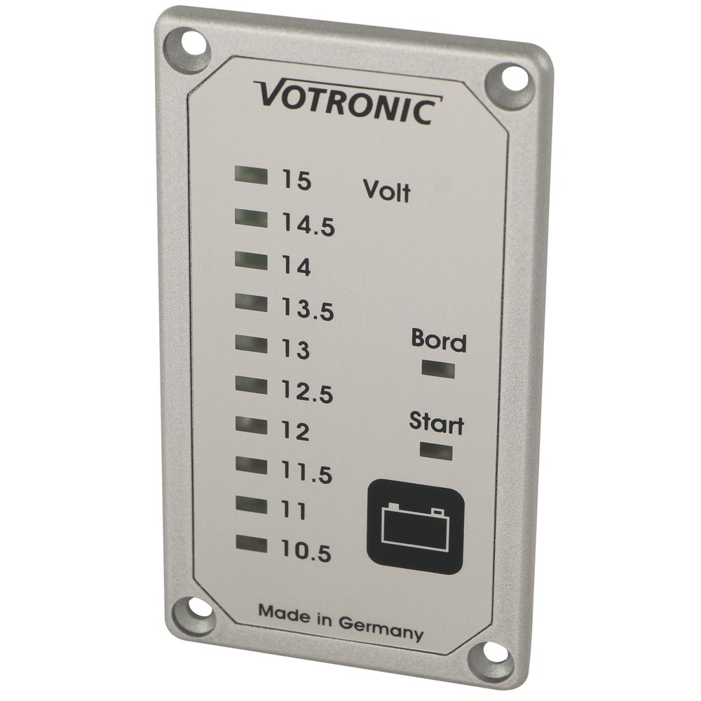 Dieses kompakte und robuste Gerät bringt wahlweise die zwei Spannungen der Bord- und der Starter-Batterie zur Anzeige. Es stellt den interessantesten Bereich der Batteriespannung von der Tiefentladung bis zur maximalen Ladespannung anschaulich dar. Die Leuchtpunktanzeige erbringt dabei eine recht genaue Anzeige der Batteriespannungen, da auch Zwischenwerte auf Grund unterschiedlich hell leuchtender benachbarter Leuchtpunkte gut abzulesen sind. Auf Tastendruck wird die Bord- oder Starter-Batteriespannung ausgewählt oder die Anzeige abgeschaltet. Bei niedrigen Batteriespannungen wird durch rote Anzeigen auf die fällige Nachladung der Batterie hingewiesen. Der Anschluss erfolgt durch Schraubklemmen auf der Rückseite des Gerätes. Der Duo-Akku-Tester S ist als Panel-Version passend zum VOTRONIC Modulsystem ausgeführt und reiht sich optimal an andere VOTRONIC Anzeigefelder an (einheitliche Höhe 85 mm). Selbstverständlich ist auch die Nachrüstung einer einzelnen Anzeige im Fahrzeug möglich. Geringe Frontplattenmasse und die besonders kleine Einbautiefe von nur 15 mm erlauben die Montage an nahezu jeder Stelle, dahinter liegender Stauraum kann weiter genutzt werden.